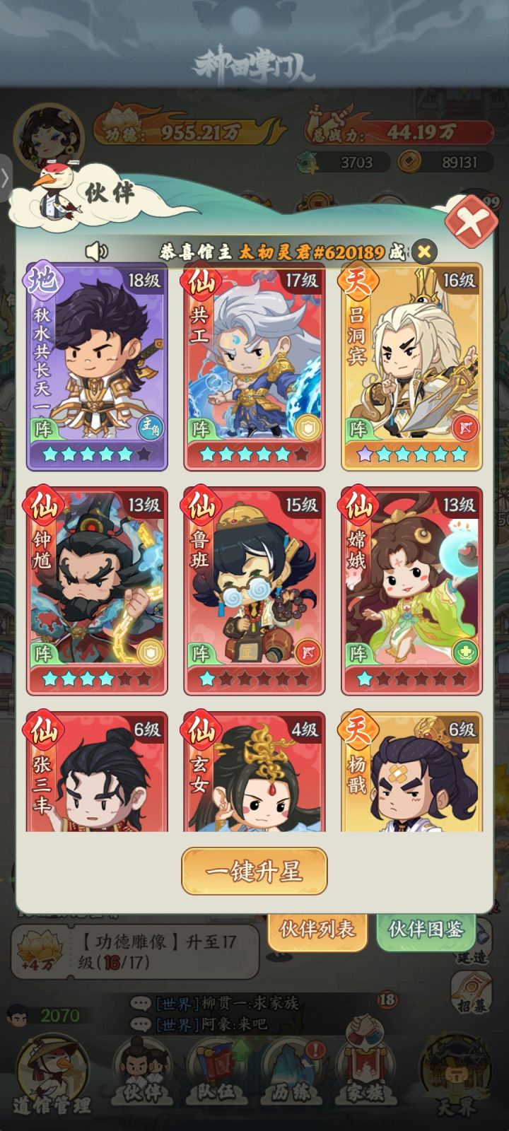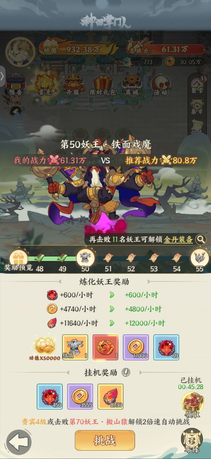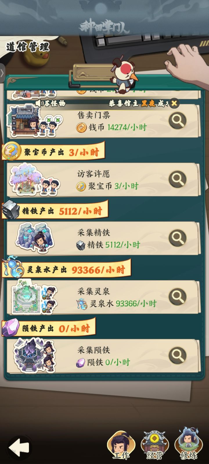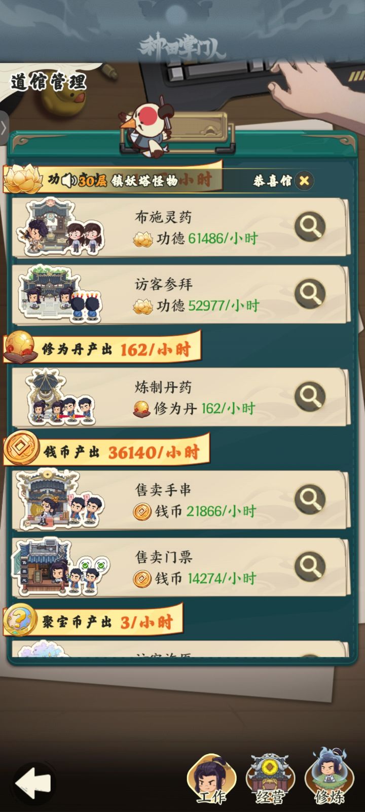 因为今天刚开服我也是第一次玩,结合以前玩这种游戏的经验也是顺利的到达16级,晚点会到17级这游戏功德相当于经验,必定首要供给,升级大殿的灵泉水和陨铁优先级最低
