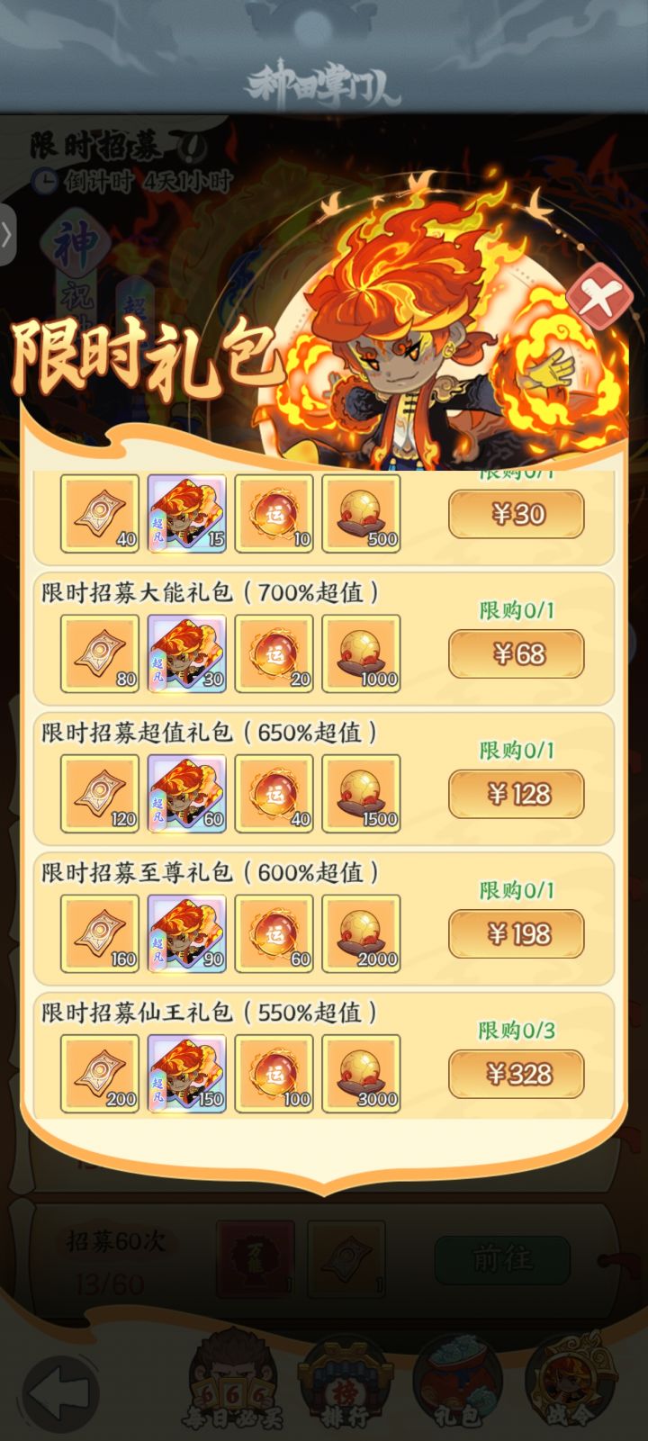 #种田掌门人 #游戏攻略嘿嘿嘿,仙友们我又来了,开服第四天了,为了下次的限时招募,这次专门出一期攻略。 ⭐️《七天限时招募活动》活动周期:每7天一轮英雄顺序:祝融→金灵圣母→金蝉子→神农英雄品阶:神品超凡英雄星级:目前最高30星本体保底规则:200抽⭐️《六轮招募卷分别消耗全明细》第一轮:200抽第二轮:200抽第三轮:200抽第四轮:400抽第五轮:400抽+专属皮肤
