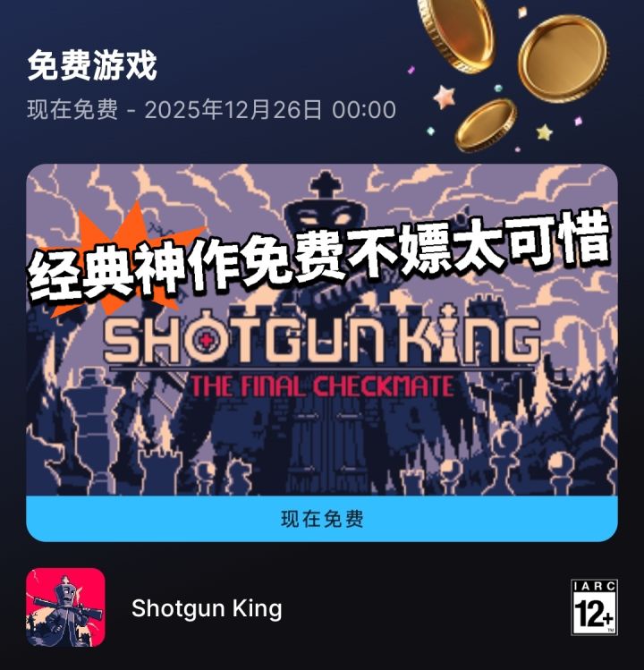 霰弹枪王 / shotgun king该游戏是一款基于国际象棋的回合制肉鸽游戏,玩家需要扮演国王棋子,手持霰弹枪不断战斗,选择适合自己的强化路线,直至最后幸存epic手游喜加一经典佳作,游戏体验独特,像素类、棋类爱好者别错过这次的白嫖机会了#主机单机 #游戏资讯 #epic喜加一 #epic