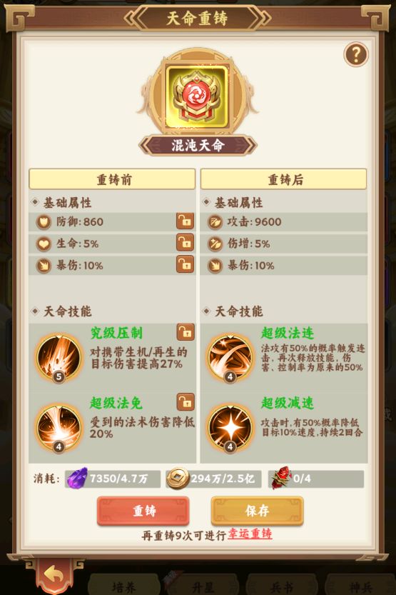 军机内阁 7.1.1武将升星 1、武将升星大厅可以将低星武将升星为同名高星武将,4星可以升为5星,5星可以升为6星。 2、升星成功后的武将突破等级上限。 3、升星成功后,作为材料的武将将返还所有的培育消耗材料(包括升级经验,进阶材料,装备和天命等)。 7.1.2武将重生 1、可消耗转生丹,将7-9星武将重生,重生后武将将返还为5星初始状态,同时退还升星消耗的本体和同阵营随机碎片。 2、.重生返还