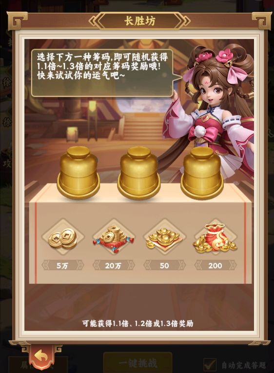 徐州之战1、徐州之战在等级达到时开启,每2天重置一次。2、玩家所使用武将会按开始挑战时属性进行战斗(该武将不能回收或作为消耗材料)。3、击败关卡守将后,将有概率触发奇遇事件。4、击败所有守将后,守将首领将出现,击败首领后可通关进行下一层。5、每次徐州之战重置时,以历史最高层数回退5层为起点,最低为1层。若主公历史最高层数大于等于198层,则回退层数变为7层。6、达到10层关卡时,可直接