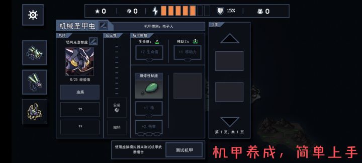 游戏玩法:玩家选择机师选择机甲,穿梭在林地、雪域、沙漠和废墟等各个大陆,与外星虫族战斗。游戏难度多样,从简单到噩梦,有4个难度,开局还可以设置成就任务,完成任务可获得金币奖励,同时可以额外添加拓展包,增加游戏趣味,如高级虫族、高级机师、高级装备和高级任务等。连续成功挑战两个大陆后,即可开启最终之战与虫族首领对战,战胜首领后即可获得荣誉点,用以购买机甲装备和核反应堆进一步强化机甲输出能力。此外,游戏还有特定的回溯玩法,每次战败可指定一名机师穿越时间,回溯到另外一个时间线,与虫族对战。
