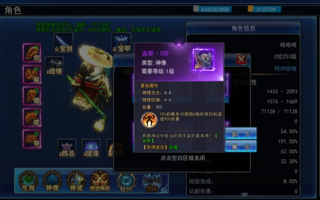 新手攻略之宙斯前期获取方法 宙斯作为前期神器,玩家尽量第一时间获取。 快速获取方式为: 先领取所有的礼包,包括进群礼包,通码礼包,还有TAP的活动礼包 至少优先弄到1级。 金币尽量优先购买商店里的神像碎片结晶(这个东西根据等级,有每日的限购) 55级以上的所有BOSS都有20%爆出一个碎片。 前期的金币,如果没有特殊需要尽量全部都去买神像碎片,第一时间把宙斯合成出来