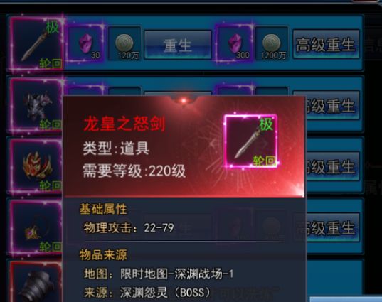 轮回装备为中期玩法。玩家角色等级达到220级,即可选择进入轮回战场击杀BOSS或者小怪获取。小怪多高掉落5阶轮回装备。220~420前BOSS最高掉落10阶轮回装备,即霸者套。420级以后的地图掉落11阶轮回装备。轮回灭世套。轮回装备的属性相对战场弱一点,但是绝对重要。分解轮回装备可以获得轮回洗练精华对轮回装备进行洗炼。建议使用高级洗练。