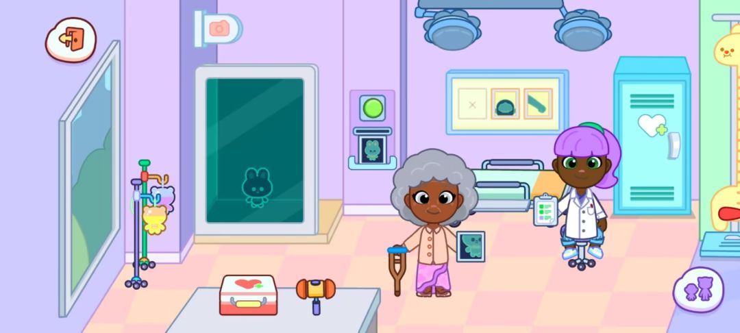 医院场景是充满责任感与趣味的医疗模拟空间,包含扫描区、治疗区、诊室、接待处和救护车区,适合演绎 “救死扶伤” 的暖心故事。 (一)扫描区:精准诊断的开始让患者角色躺在 X 光扫描仪上,点击 “启动” 按钮后,屏幕会显示骨骼投影(卡通化处理,无真实医学细节)。抽屉里的镊子可 “夹出” 虚拟异物,石膏绷带和拐杖能为 “骨折” 角色固定伤处。输液架支持 “挂吊瓶 - 调节流速” 操作,搭配 “喂药” 互