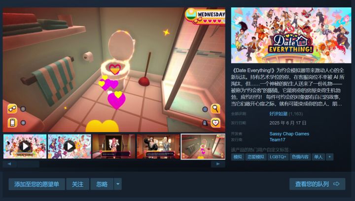 LOVE!Love!love!我压抑了。是的没错,我的欲望如同干枯的野草,一颗火星,就能酿成一场烧遍一切的大火。又一次,我试图点燃自己的枯草,可自燃的次数多了,费尽心力却打不出那颗火星。我把目光投向steam。这个来自Sassy Chap Games开发,Team17发行的超现实恋爱模拟游戏《Date Everything!》,它会解决我的烦恼吗?哈哈,也许我发了疯,玩真人恋爱影游还不够