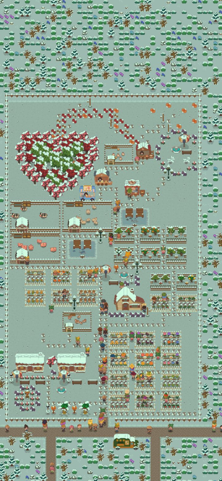 玩了快11个小时,终于把农场变成了我喜欢的样子。。。所有农产品都是3份,比较空的场地也用装饰品填了一下,天黑也比较漂亮。当然关系也全拉满了。。。2025.8.9因为游戏更新了,所以我也调整了一下,并且把河边农场也搞好啦~河边农场因为地方不够大,农产品只能一份了。