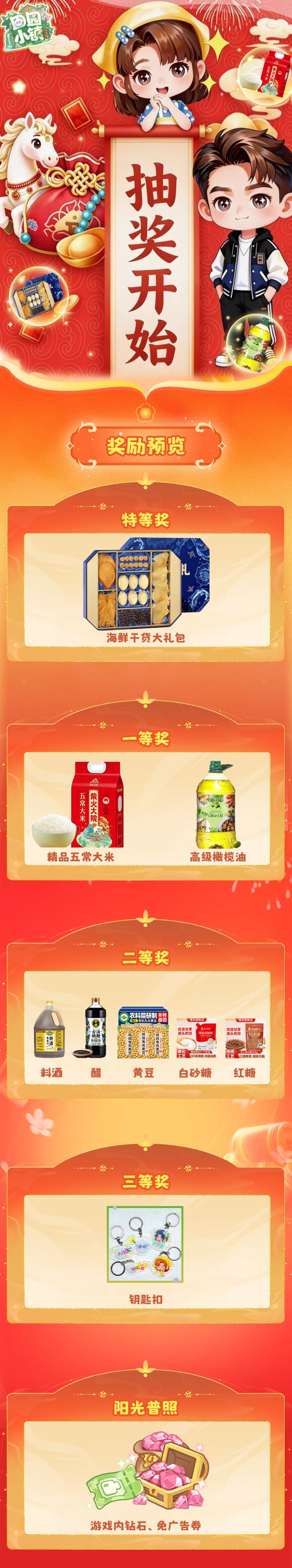 镇长大人们集合啦!新春佳节已过,年味仍在身旁~祝各位镇长马年大吉、万事顺意,三餐四季皆安康,岁岁年年皆欢喜!为感谢全渠道每一位玩家的陪伴与支持,田园宠粉福利第一弹正式上线 —— 实物粮油大礼包免费送,还有游戏内专属福利加持,人人都有机会抱走惊喜,主打一个宠粉不手软!宠粉奖品清单,干货拉满!✅ 特等奖:海鲜干货大礼包✅ 一等奖:1.精品五常大米 2.高级橄榄油✅ 二等奖:1.料酒