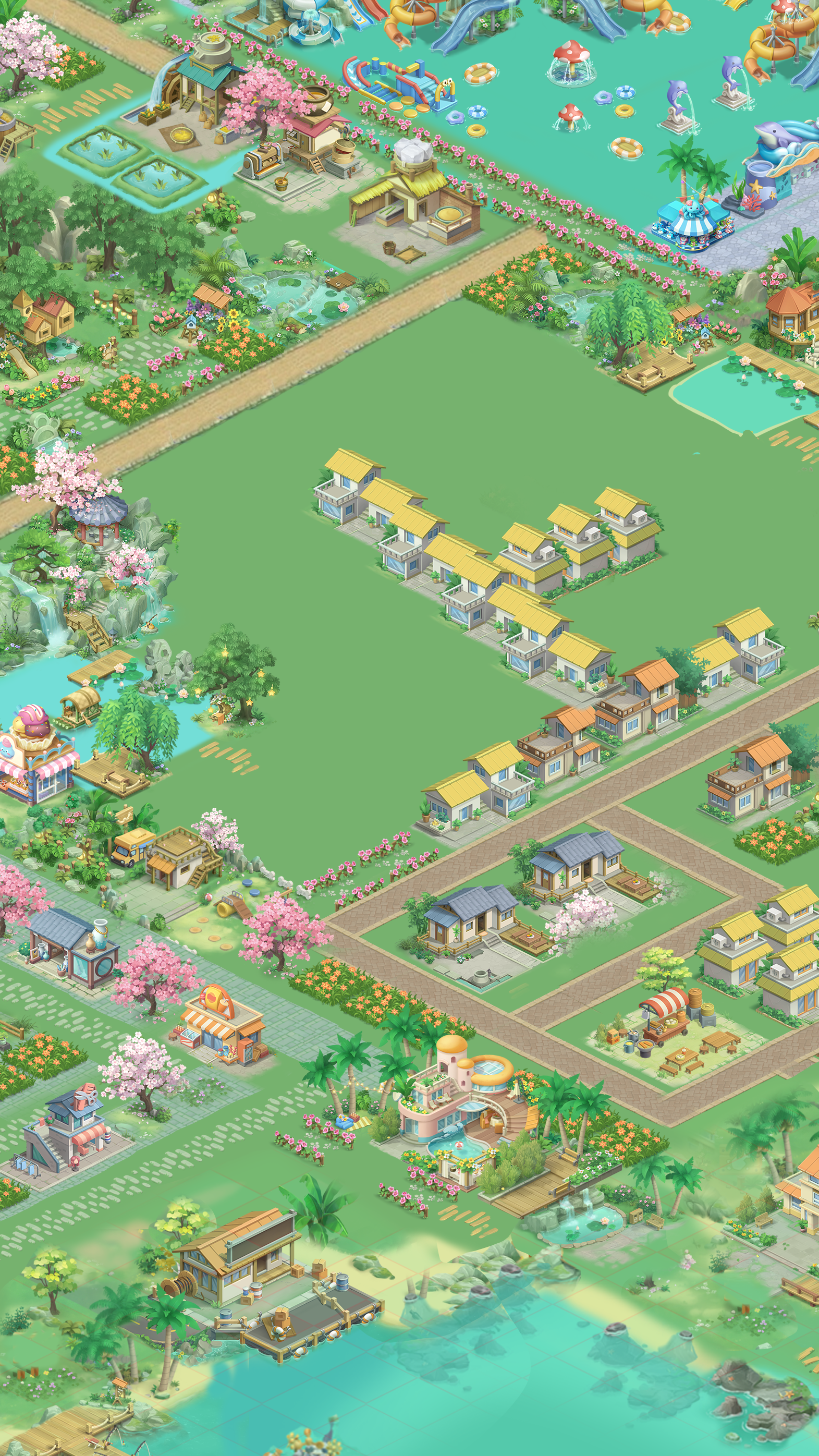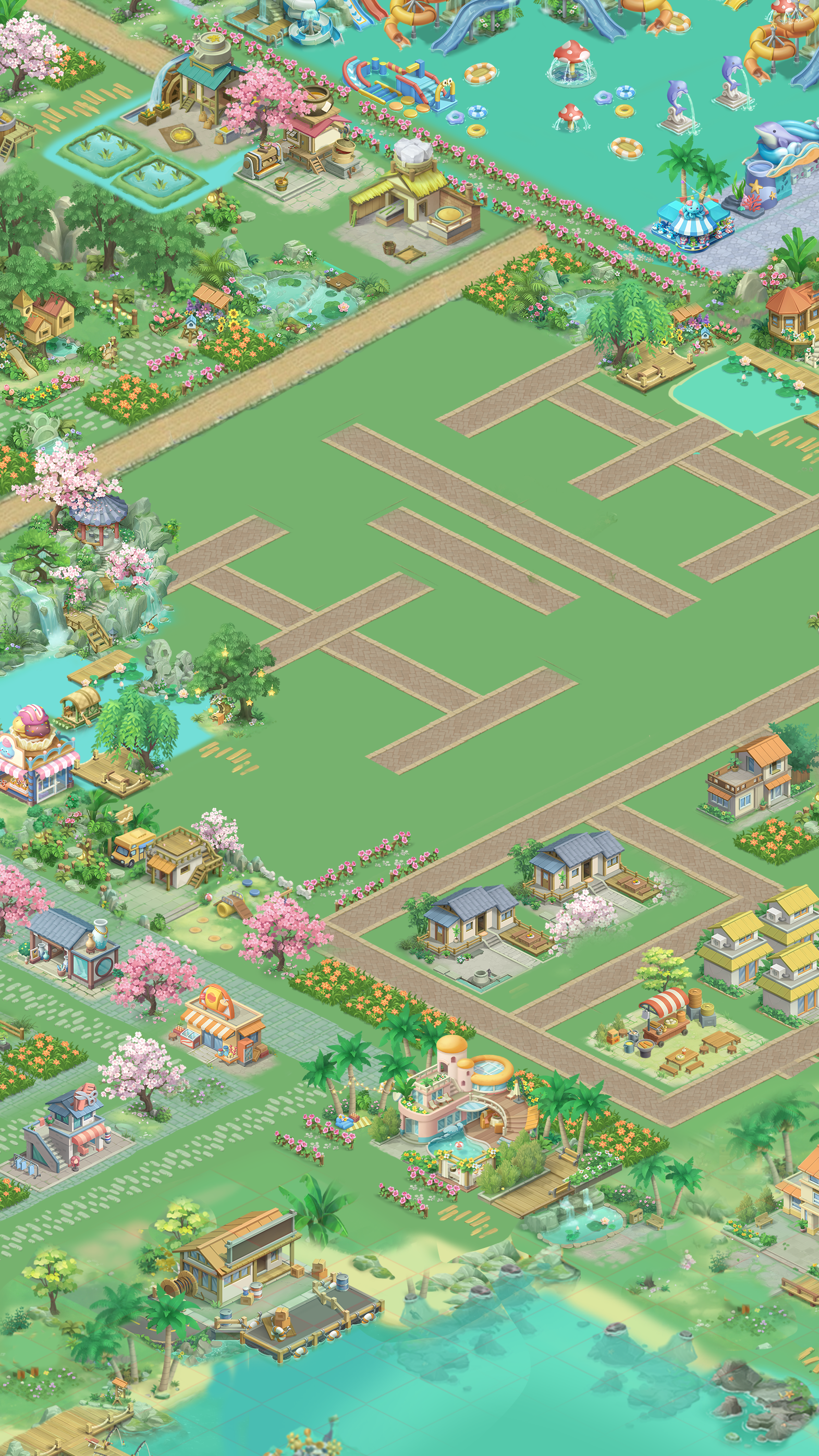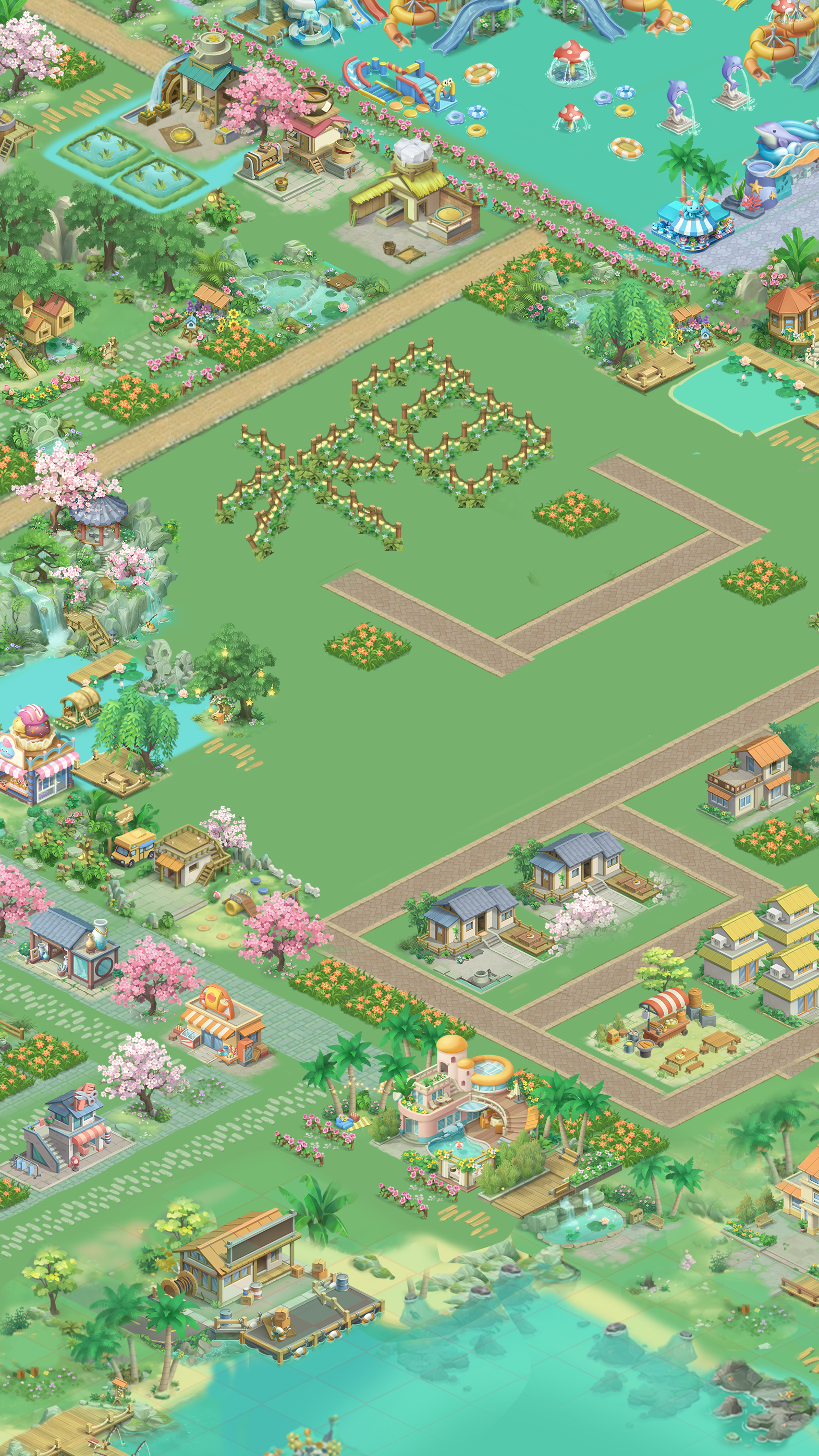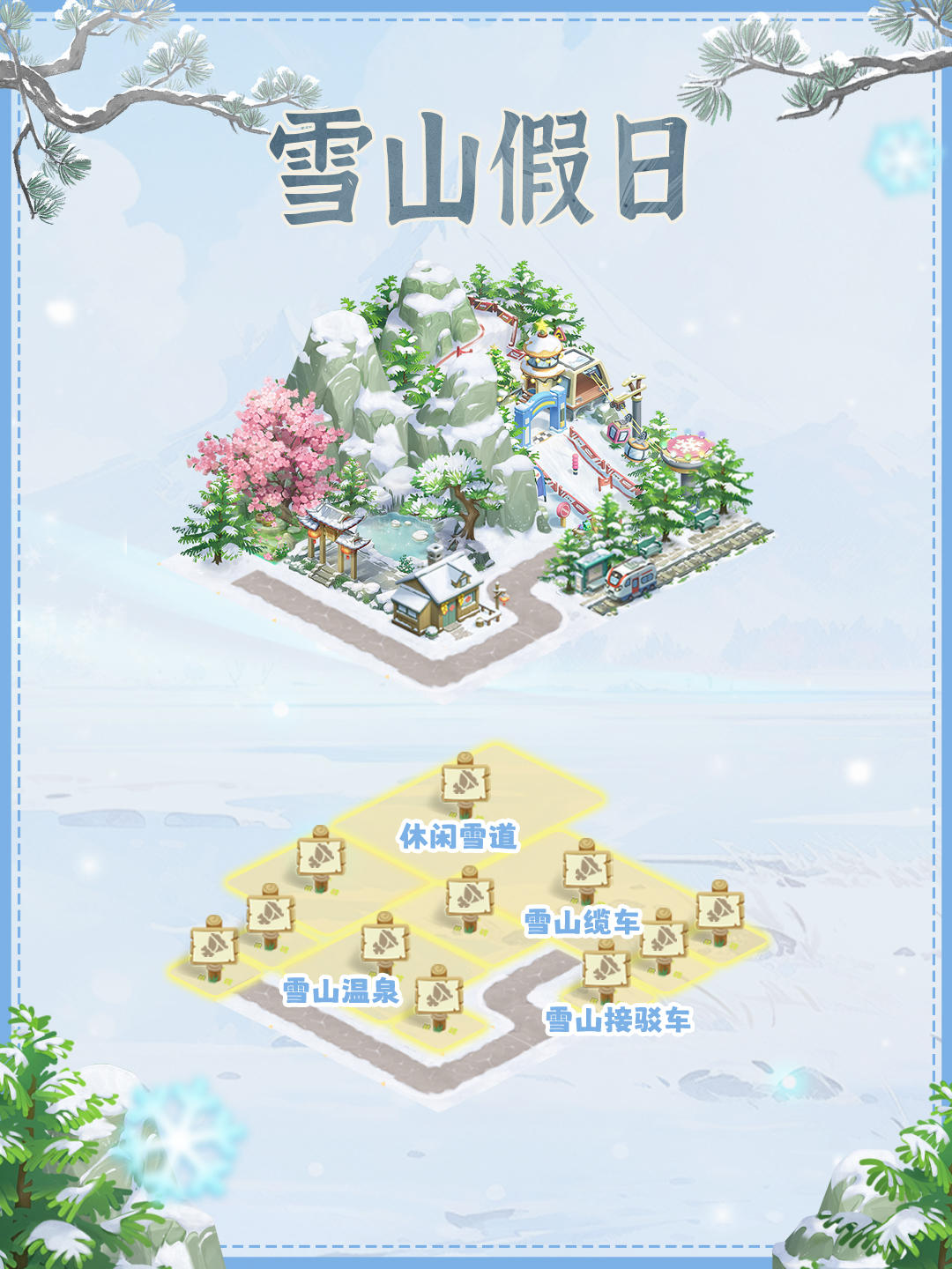 当第一缕春风拂过雪地,你会看见: 雪檐垂露映着桃粉,冻土翻绿钻出花茎,小鹿踏雪踩出的脚印里,转眼冒出自带 “雪绒帽” 的雏花。 在这里造城,不用选 “春或雪”—— 你可以让雪坡下围起樱花步道,让温泉旁堆着奶油雪屋,甚至给雪人戴上迎春花编的花环; 动态气候随你调:清晨让雪花落在刚绽放的花苞上,午后让暖阳融雪滋养新栽的树苗,傍晚让春雾裹着雪粒给建筑镀上 “糖霜”。 每一块砖瓦都能藏住两季的浪