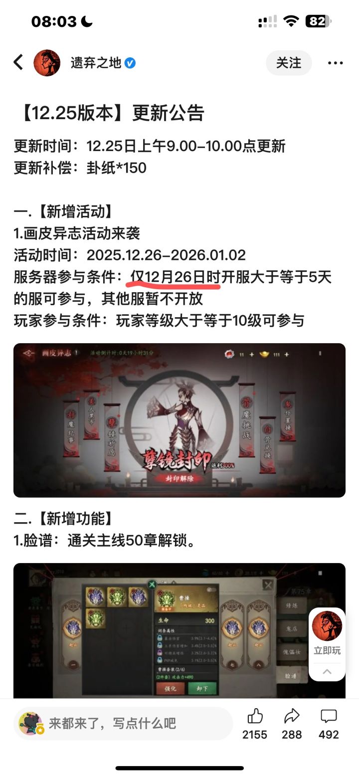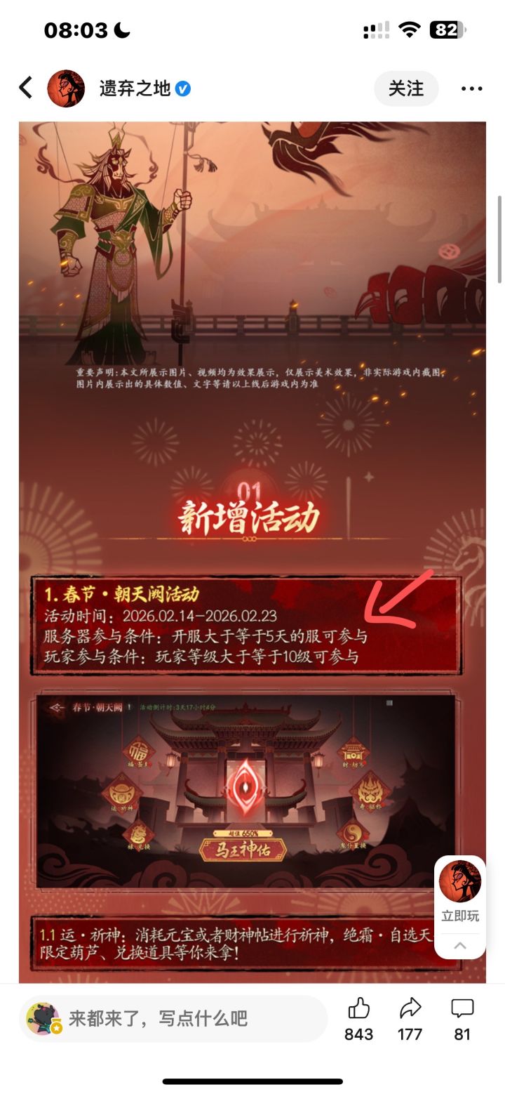 【更新时间】2026年2月13号 9:00-10:30【更新补偿】卦纸*150【更新形式】停服更新提前祝大家节日快乐,辞旧迎新也别忘了来游戏领取节日福利哦~