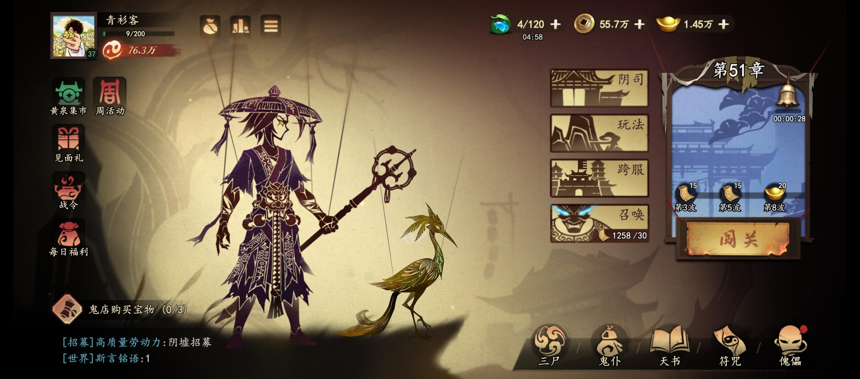 首充6➕月卡18➕鬼仆卡30➕免广告卡68第八天76万过50章