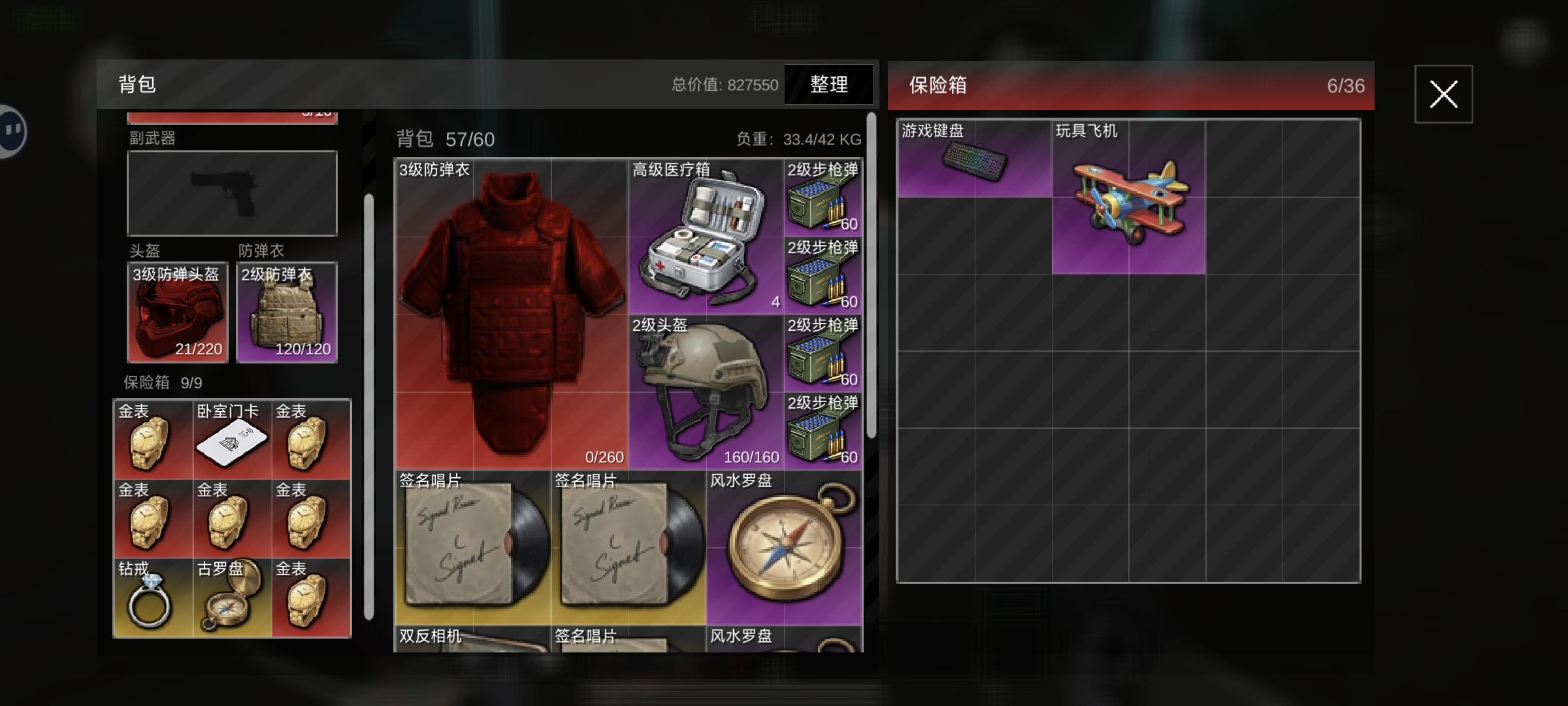 中途有医药箱容错,共8个高级箱子,2个装备箱(出三级甲概率较低可不拿),2个子弹箱,1个保险柜