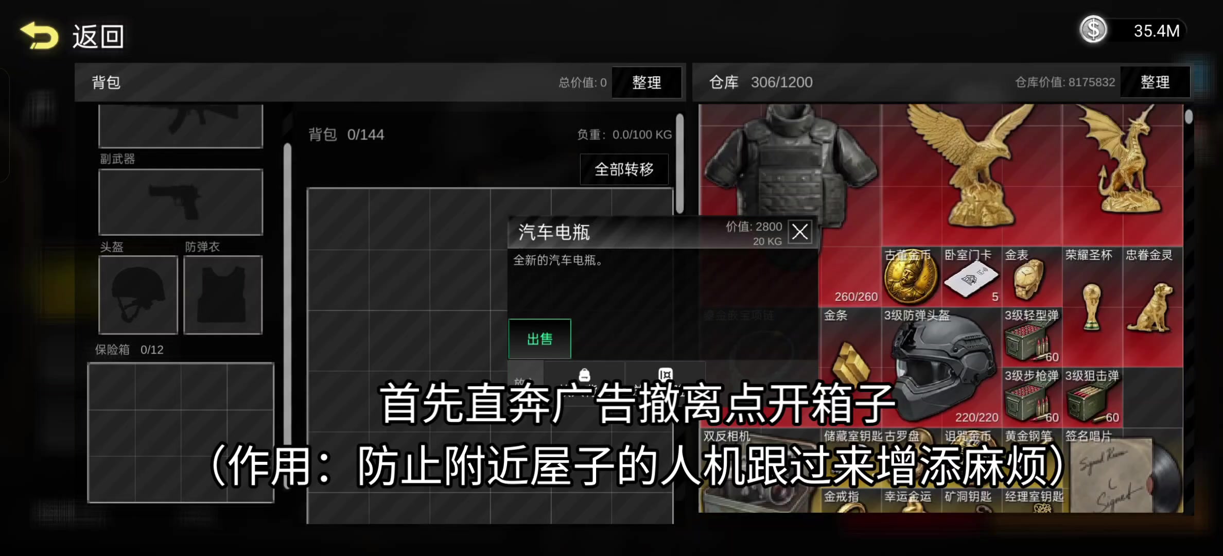 视频演示的是绝对安全的路线,不用带任何东西,绝对0成本,绝对能安全撤离的轮椅,考虑到广告时间估算为3分钟。 摸了别墅一楼1保险+5金,别墅二楼2保险+4金,撤离点1金。 懒得跳的可以只摸一楼的箱子,或者看哪个二楼箱子顺眼摸一摸。 dlc1:极致安全贪。可以先把山脚下3个金箱子贪了再执行视频操作,如果不杀人机有一点点🤏🏻风险,但用150血的角色基本也是0杀无风险的。不过我是懒得摸了。 dlc2:贪矿