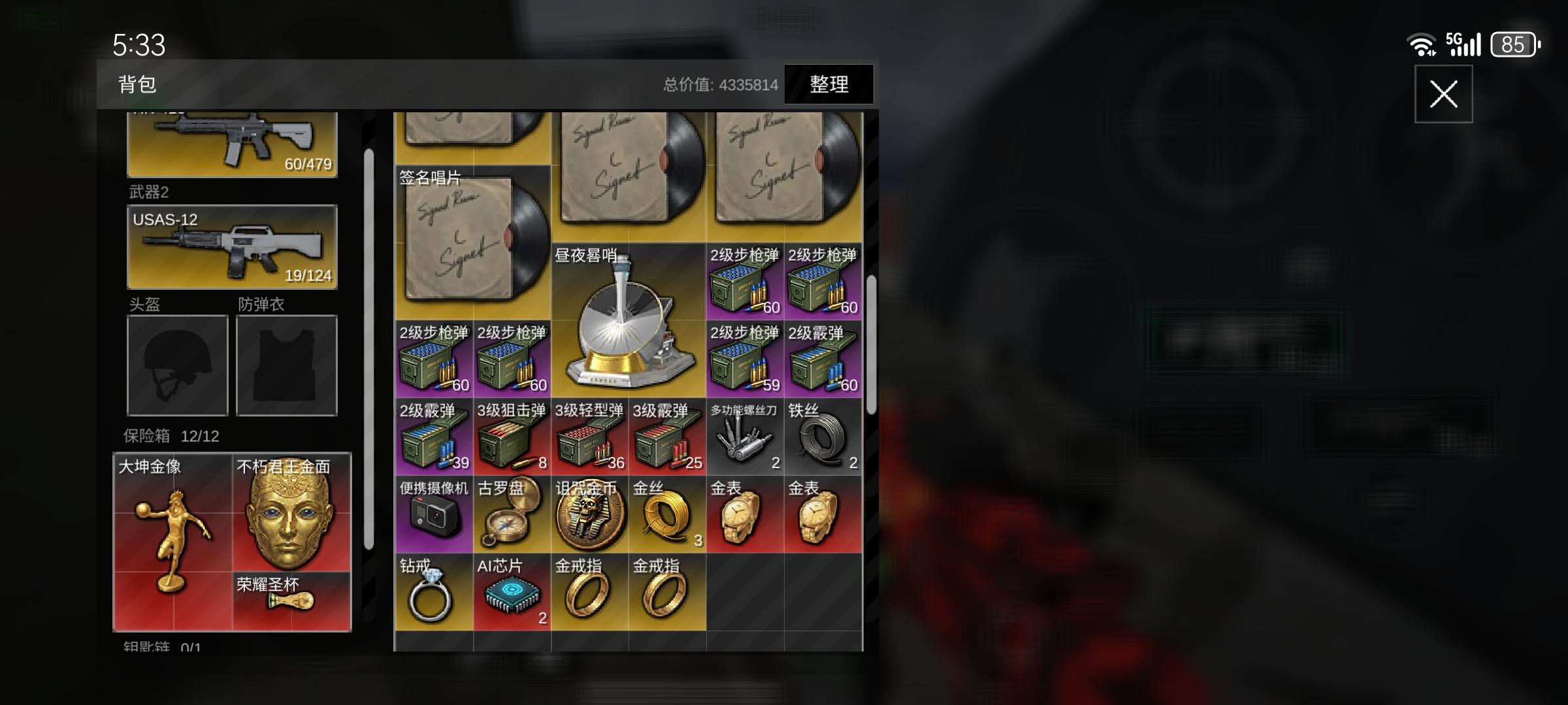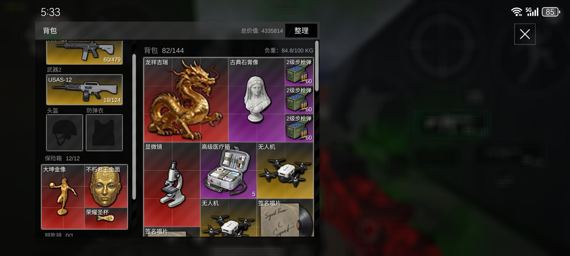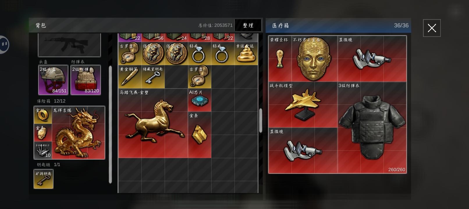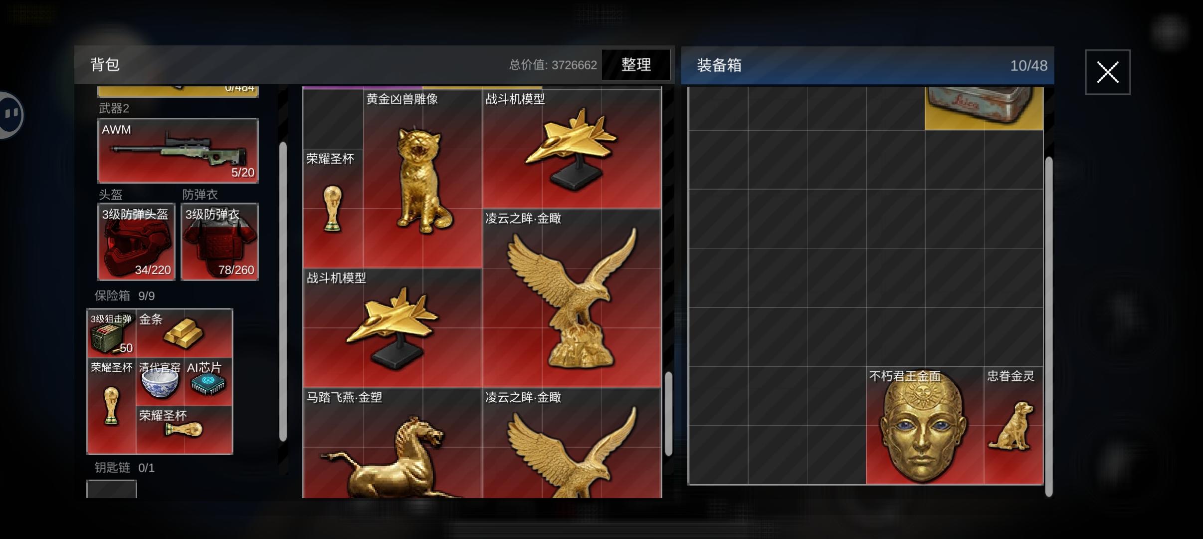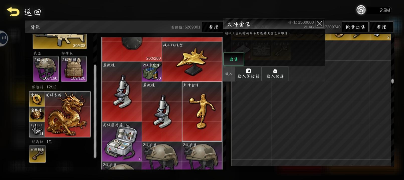 古董金币888.8k,1格,0.8kg掠天之翼·金朔360k,6格,6kg荣耀圣杯280k,2格,1.25kg凝云之眸·金瞰130k,9格,5kg忠眷金灵90k,2格,3kg金表68k,1格,0.25kg金条68k,2格,2kg镶金嵌宝项链52k,4格,0.8kg