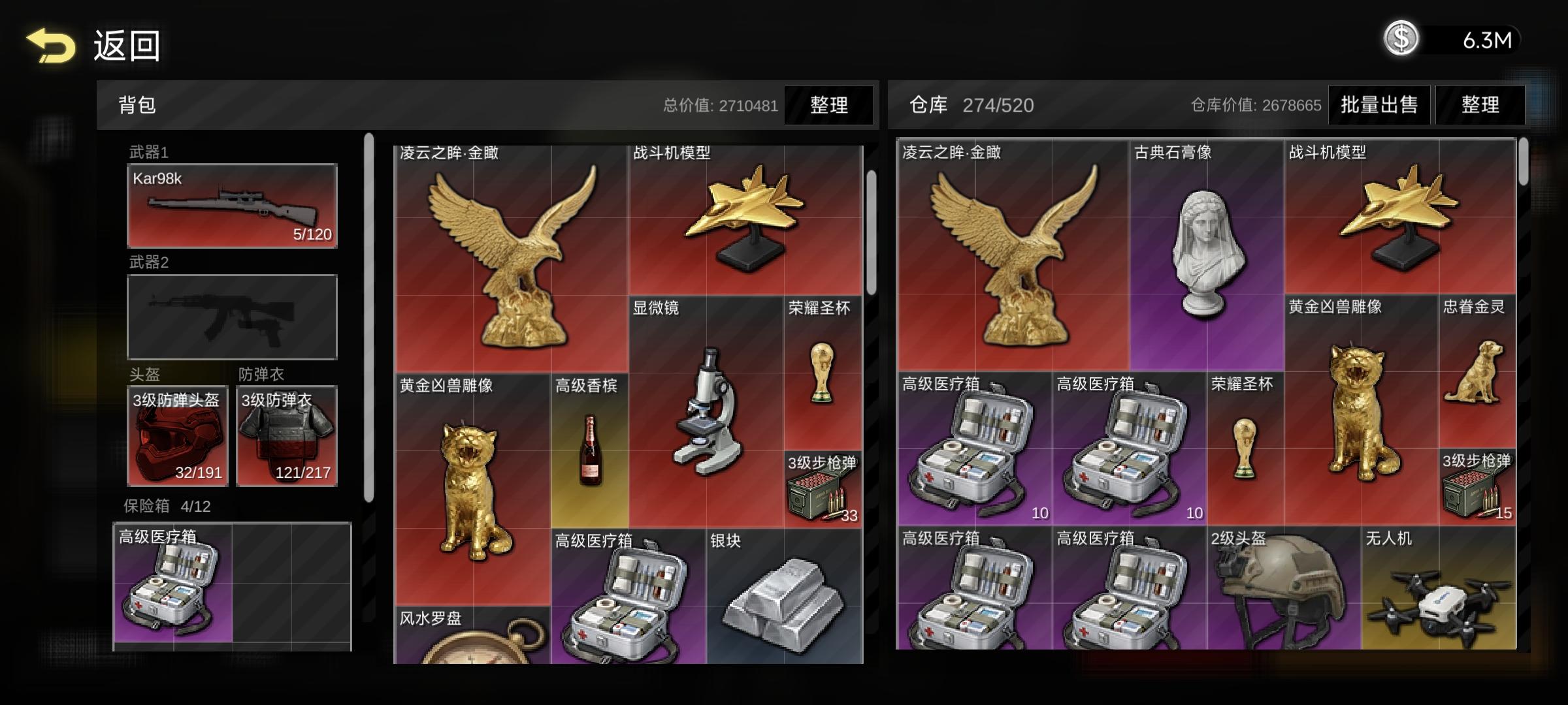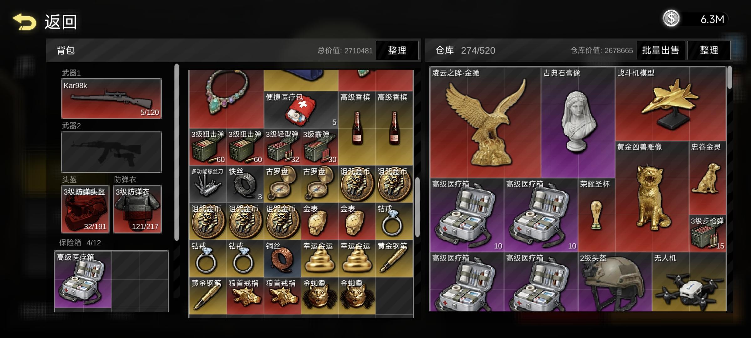 古董金币888.8k,1格,0.8kg掠天之翼·金朔360k,6格,6kg荣耀圣杯280k,2格,1.25kg凝云之眸·金瞰130k,9格,5kg忠眷金灵90k,2格,3kg金表68k,1格,0.25kg金条68k,2格,2kg镶金嵌宝项链52k,4格,0.8kg