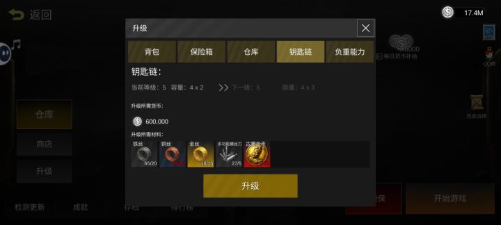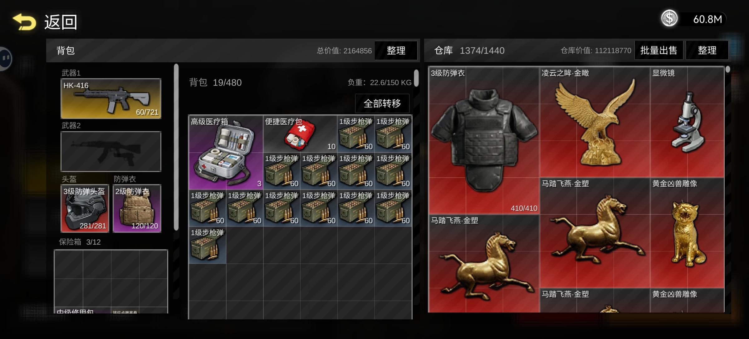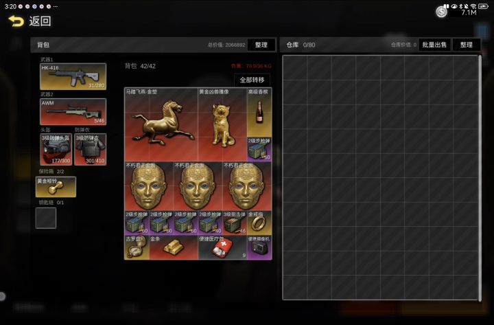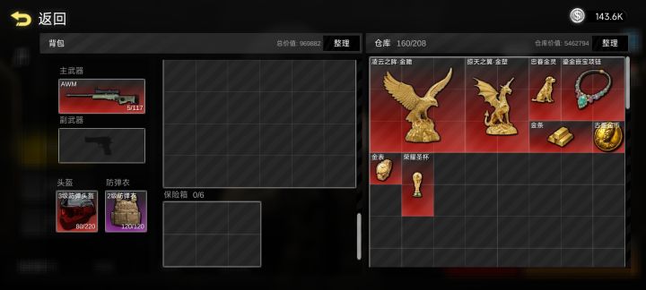 古董金币888.8k,1格,0.8kg掠天之翼·金朔360k,6格,6kg荣耀圣杯280k,2格,1.25kg凝云之眸·金瞰130k,9格,5kg忠眷金灵90k,2格,3kg金表68k,1格,0.25kg金条68k,2格,2kg镶金嵌宝项链52k,4格,0.8kg