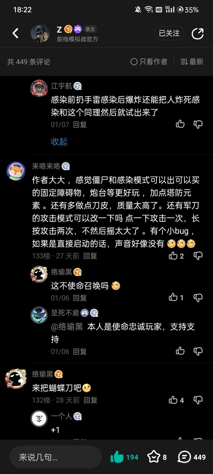 从这位朋友的贴子来看官方要加入一个全新的boss,而且根据官方的描述的话,强度应该爆炸!我目前能得到的信息也就这些。大家可以好好期待一波(Boss会掉落专属的武器?)(Boss会掉落专属的武器皮肤?)让我们来看一下玩家们的建议吧!首先就是第一条评论,这条评论主要说的就是狙击枪的手感问题!这一点,玩家所希望官方做的就是将背景做成可调节式的,可以自由切换二倍,四倍,三倍的那种 因为在开写实状态下的话