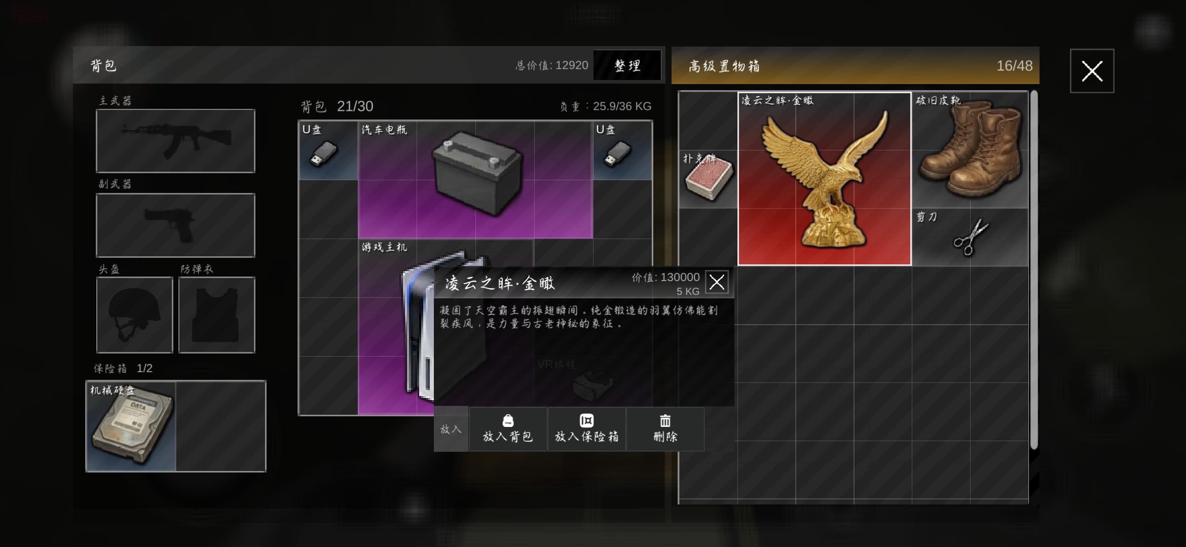 古董金币888.8k,1格,0.8kg掠天之翼·金朔360k,6格,6kg荣耀圣杯280k,2格,1.25kg凝云之眸·金瞰130k,9格,5kg忠眷金灵9k,2格,3kg金表6.8k,1格,0.25kg金条6.8k,2格,2kg镶金嵌宝项链5.2k,4格,0.8kg