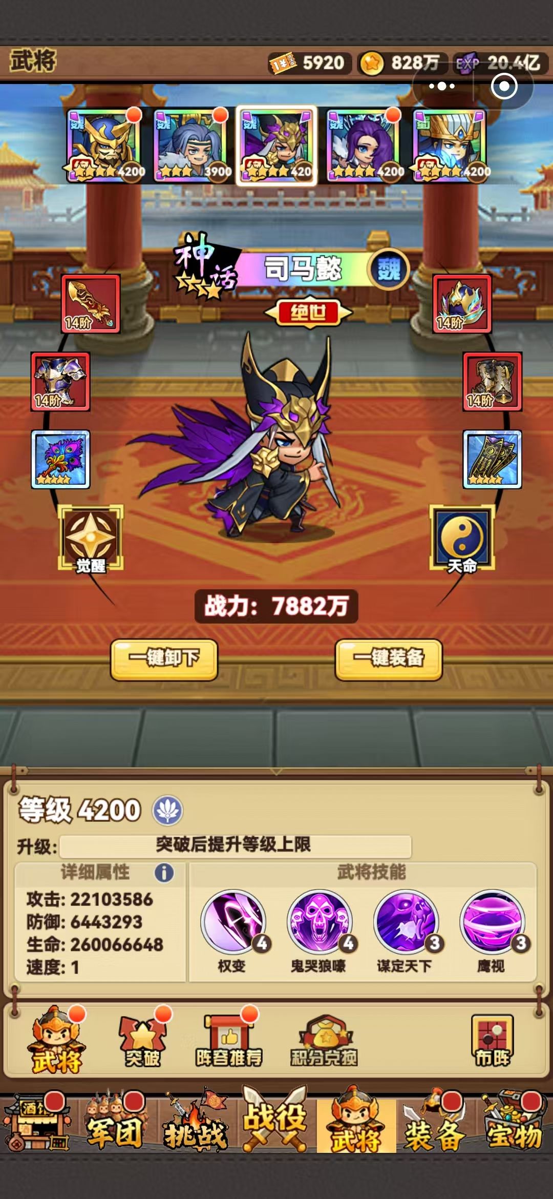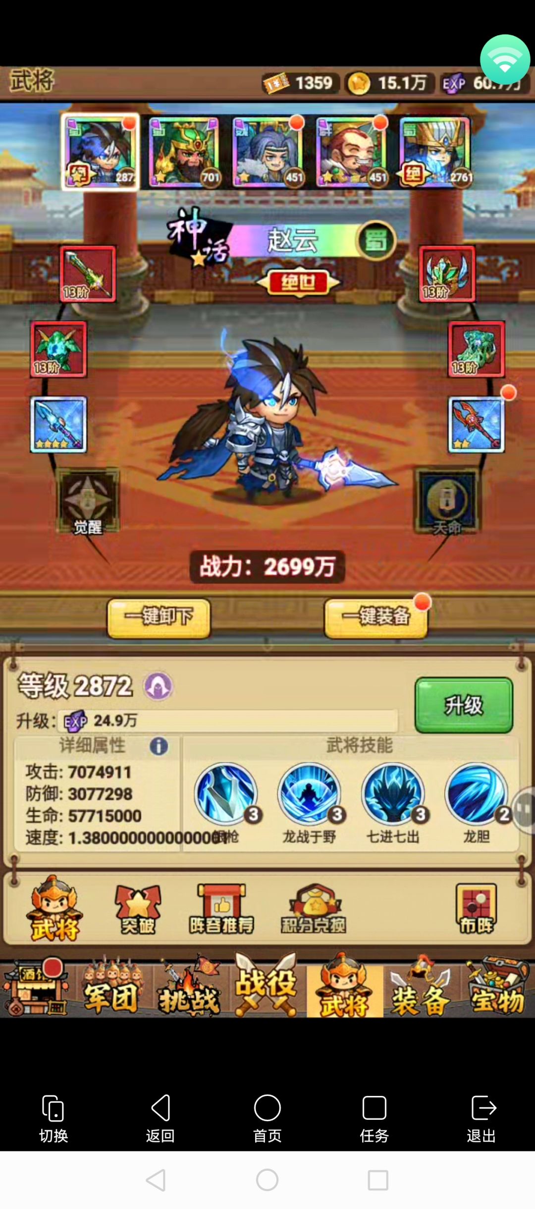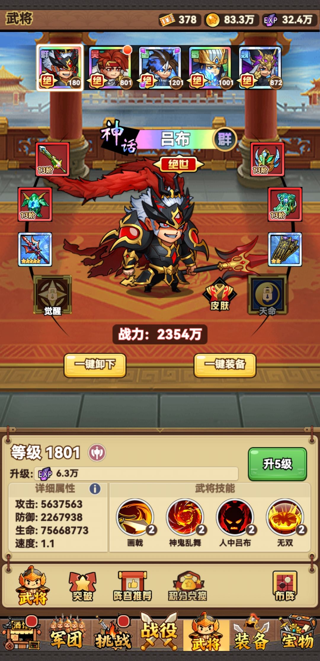 武将沿袭其他三国游戏,分四大势力,魏、蜀、吴、群 橙将分两种,一种绝世神将 每种势力有两个绝世神将 绝世神将和普通橙将有60%左右的数值差距,同星级绝世神将各项数据比普通橙将高60%左右 但是绝世神将升星比普通橙将要难 绝世神将升星,必须要两个相同的绝世神将合成 普通橙将升星,只需要同势力的其他橙将即可 所以,对于普通橙将来说,如果你不追求上场五个同势力的武将激活25%加成的话,每个