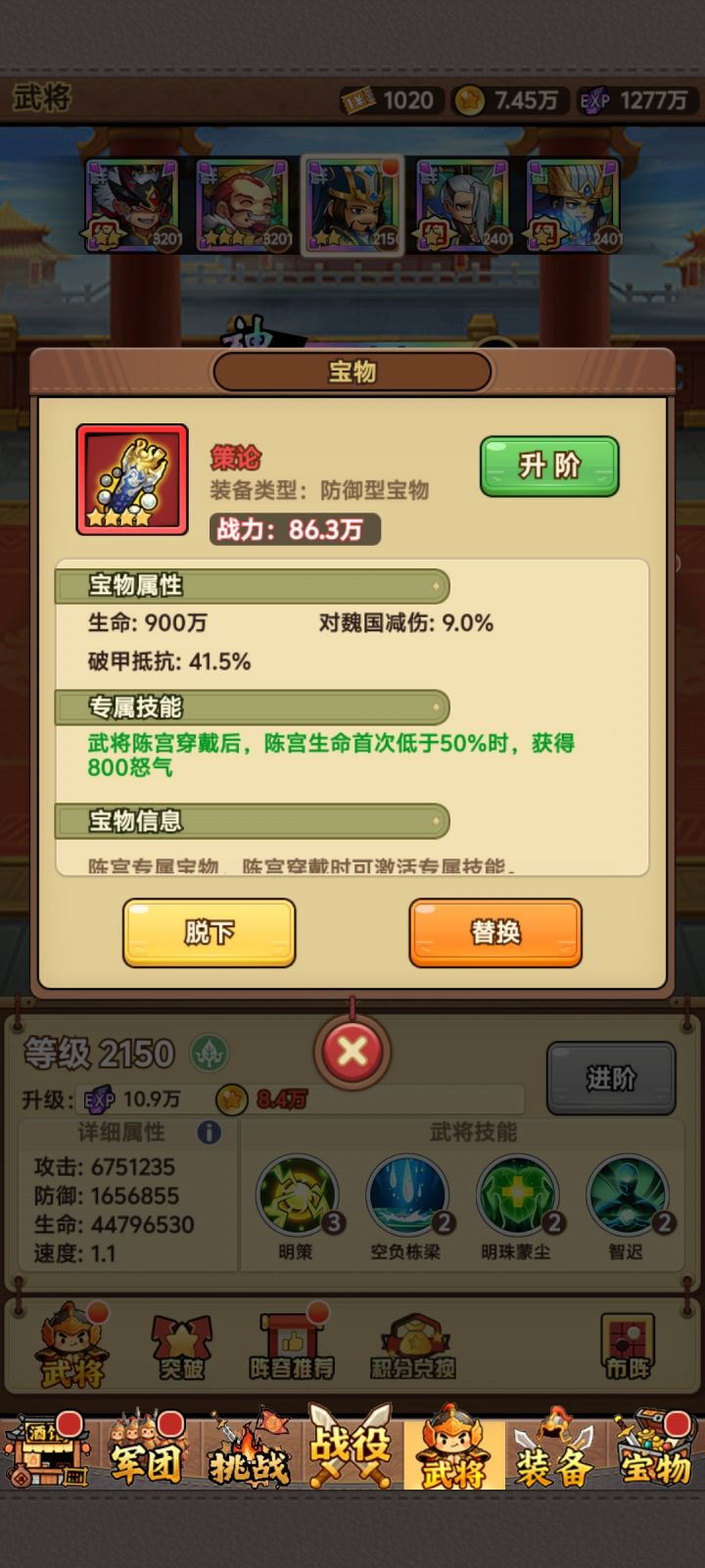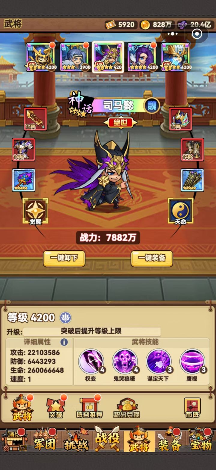 目前版本推关吕布最强,搭配辅助和控制,基本畅通无阻。前期配合左慈陈宫袁术诸葛,后期诸葛在前排会被秒掉,将左慈换成孙策,为全队提供怒气回复。两个特殊关卡分别是诸葛亮和左慈,需要按图中阵容,利用机制通过。吕布右槽可以不选绝世宝物,常规过图可用麒麟枪,遇到闪避BOSS可以换饮血剑。后期关卡闪避非常高,命中很重要,主力吕布的天命尽量洗命中,堆到90-100比较OK,副将洗一条命中就OK,左槽可以都选龙
