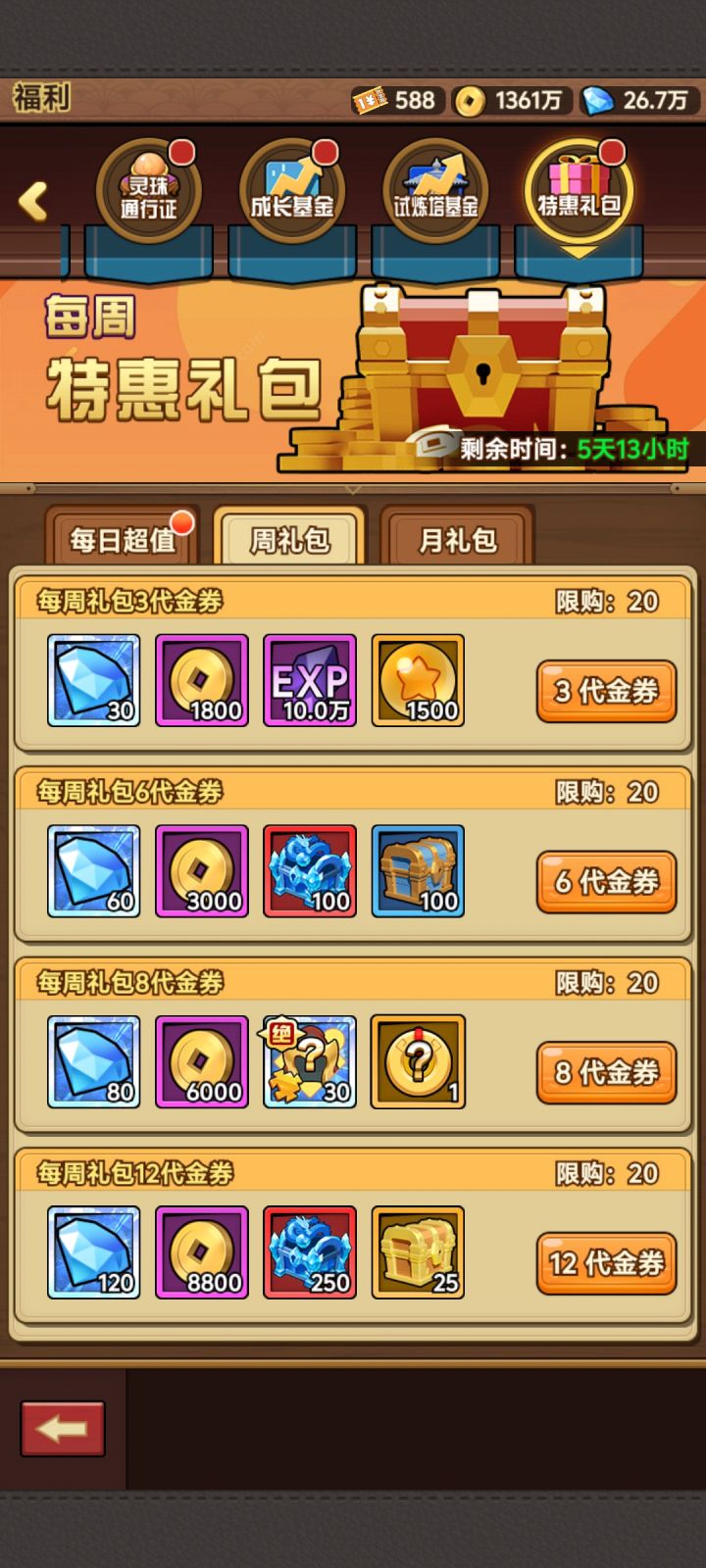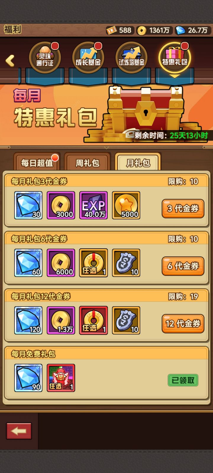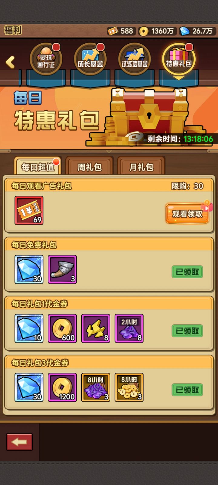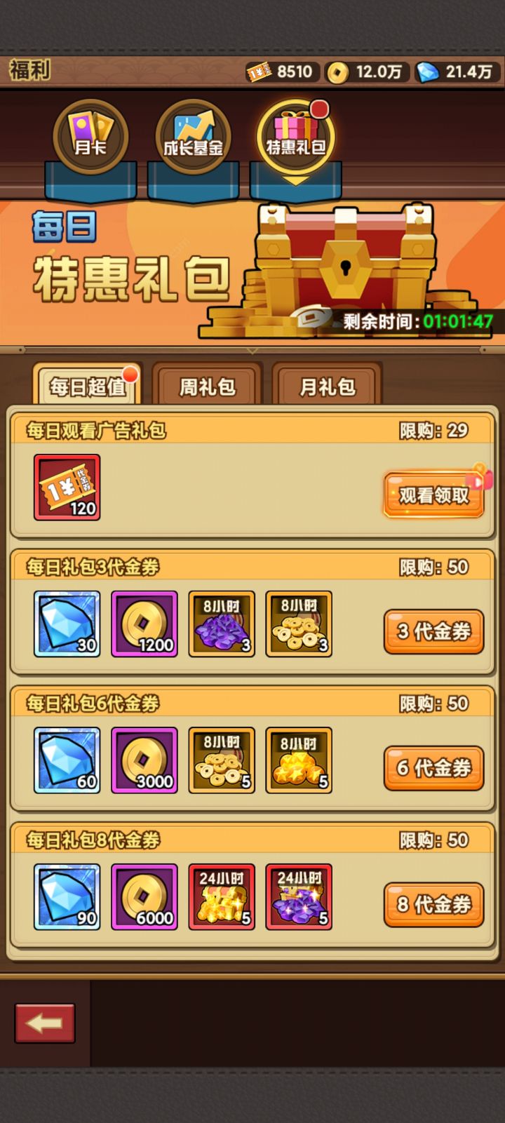 1. 特惠礼包购买策略- 每日特惠:建议看完每日广告后,把每日特惠礼包全部清空,这属于性价比极高的投入。当然,这也看个人的资源储备情况。(图一)- 每周特惠:同样建议清空,但其中标价3块和25块的礼包性价比极低,不值得购买。(图二)- 每月特惠:建议清空,但标价3块、6块、12块的礼包可以直接跳过,避免浪费资源,(图三)2. 普通角色养成细节对于非绝世的普通角色,养成前可以先