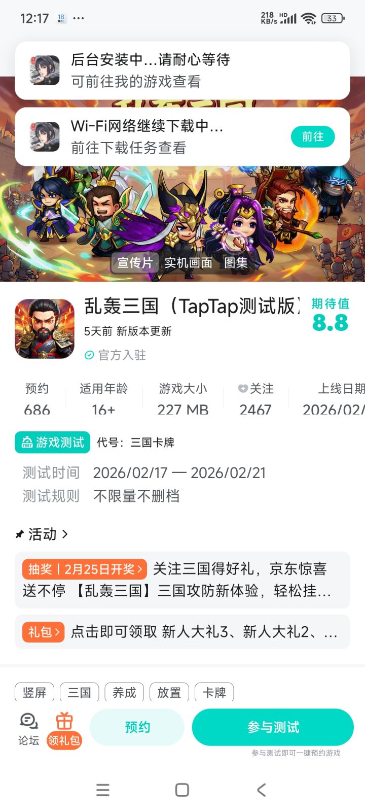 各位玩家们好呀!我们《乱轰三国》将和大家见面啦。这是一款放置类三国题材卡牌游戏,可挂机,不肝不氪。预约游戏即可参与抽奖哦!🔥【颠覆传统,三国策略新体验】🔥 《乱轰三国》以即时战斗+塔防攻城+跨服国战为核心,打造掌上三国超燃策略战场!百余座历史城池、百位三国名将自由招募,从桃园结义到赤壁烽火,经典战役全还原。武将技能连携触发“碎屏级”特效,张飞吼退千军、诸葛亮借东风破敌,每一场战斗都是视觉与策略