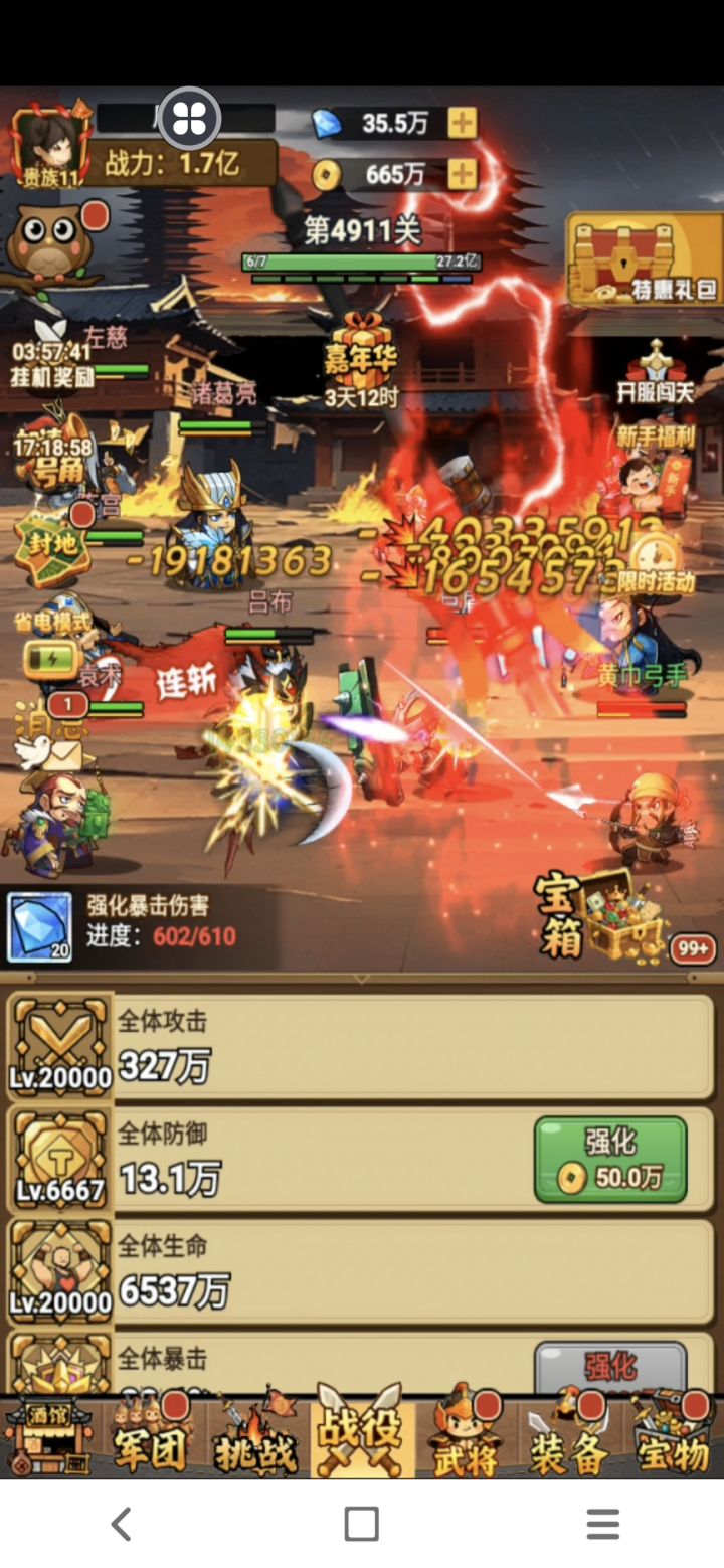 【乱轰三国】征战第4911关,吕布助我突破重围!大家好,我是《乱轰三国》的忠实玩家,今天想和大家分享一下我在游戏中的最新战绩!目前我已经成功挑战到第4911关,战力达到了1.7亿,这离不开游戏中各位武将的强力支持,特别是吕布的连斩技能,在关键时刻总能扭转战局!在游戏中,我通过不断强化全体攻击和生命值,目前全体攻击已达到327万,生命值高达6537万,这让我在面对高难度关卡时更加从容。此外,游戏