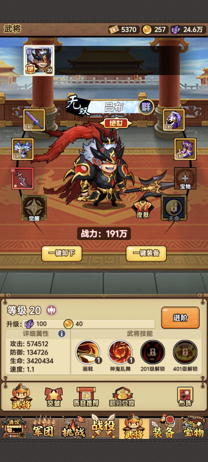 目前版本推关吕布最强,搭配辅助和控制,基本畅通无阻。前期配合左慈陈宫袁术诸葛,后期诸葛在前排会被秒掉,将左慈换成孙策,为全队提供怒气回复。两个特殊关卡分别是诸葛亮和左慈,需要按图中阵容,利用机制通过。吕布右槽可以不选绝世宝物,常规过图可用麒麟枪,遇到闪避BOSS可以换饮血剑。后期关卡闪避非常高,命中很重要,主力吕布的天命尽量洗命中,堆到90-100比较OK,副将洗一条命中就OK,左槽可以都选龙