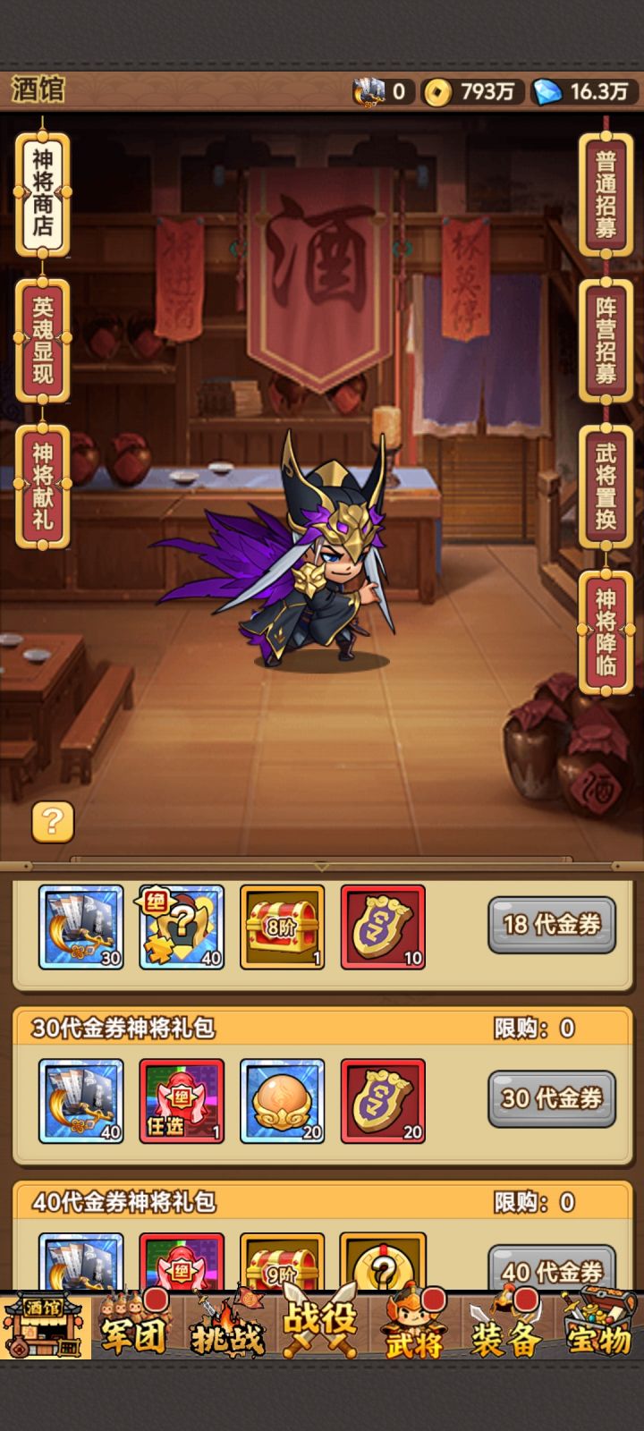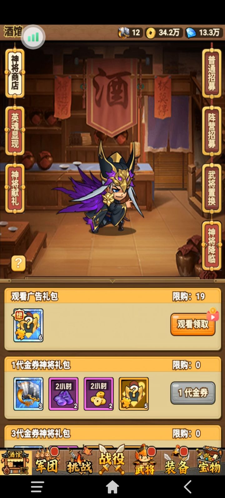 推荐阵容:吕布、左慈、陈宫、袁术、华佗开局篇:过了指引就点左上角猫头鹰~福利~特惠礼包把30个69卷广告看了,然后把每日特惠都买完(每日必买),然后去限时活动把积分达标招募令买了。然后去酒馆抽300抽。可以开启神将降临,神将商店买满68那档的抽了后然后抽阵营的(群雄强势)做完这些绝世无双箱子选吕布、左慈。群雄阵营抽的陈宫,袁术,华佗突破下。 挂机100关开宝物,里面神器降临68买满,拿了神器就