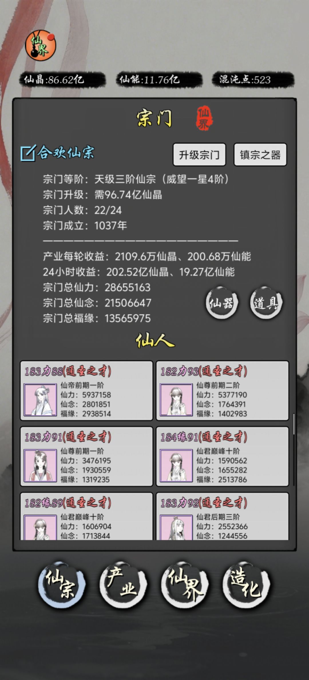 仙器 关于仙器:前期什么都没有、有什么用什么(仙界仙器放在凡界则对应效果不会生效!) 前期主要用造化玄天器、造化圣器和混沌积分赠送的仙器为主 仙器词条:白色词条是类型固定但是可以通过洗练改变数值大小 蓝色词条目前有30多种、每次洗练都会随机变更且不会重复 词条选择:仙界:有一个晶产词条最低、在此基础上增加各仙人仙力/仙念/福缘百分比这种词条越多越好, 红塔,有晶产百分比就行,金塔晶产百分比就行+