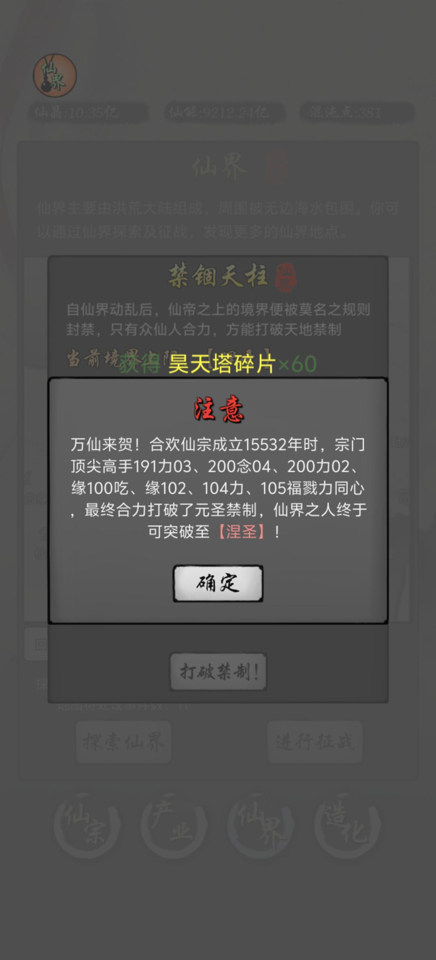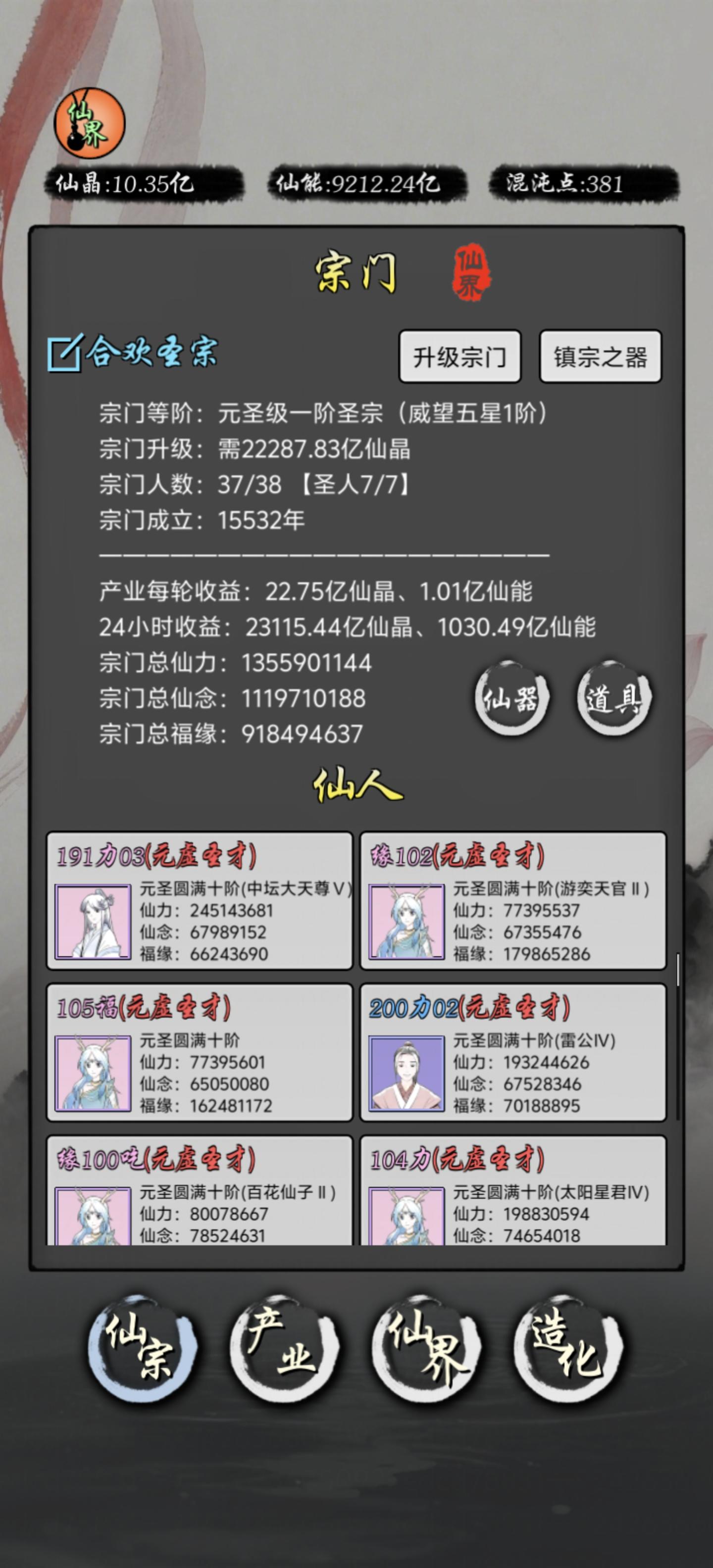 先把仙界的各项资源简单说一下仙晶:升级仙人(仙解全额返还)、升级宗门、升级产业、购买商品仙能:升级弟子(放逐全额返还)、推关卡、升级深渊之力、升级深渊通道、合层、购买商品各种丹药:这个可以随便喂给仙人增加属性、仙解仙人后会全返还、最重要的作用是中期进入虚灭迷域后提升主力仙人的战力涅盘换仙丹:可以重置仙人的三项基础属性,洗60次后每次有30%概率返还最高可以洗出单项资质为总资质x53.4