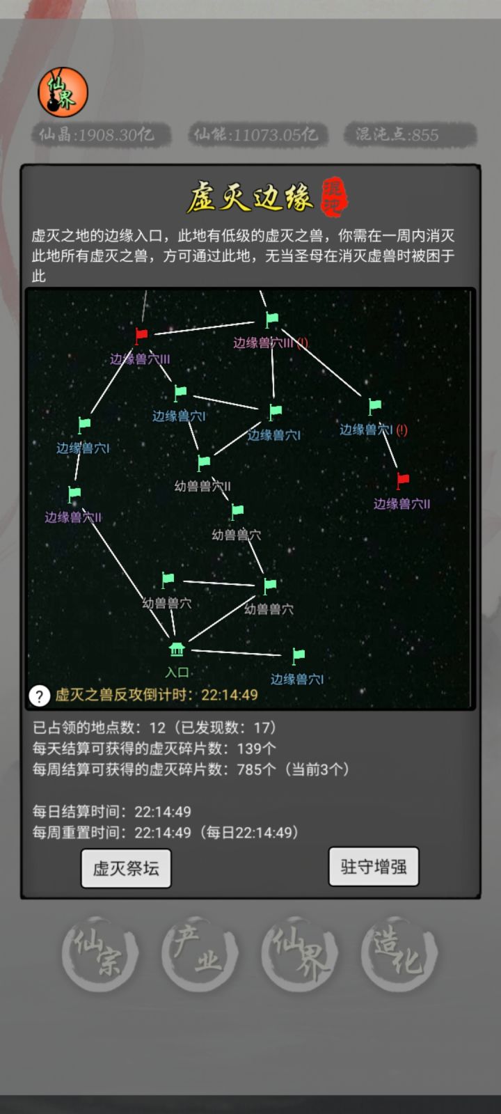 先把仙界的各项资源简单说一下仙晶:升级仙人(仙解全额返还)、升级宗门、升级产业、购买商品仙能:升级弟子(放逐全额返还)、推关卡、升级深渊之力、升级深渊通道、合层、购买商品各种丹药:这个可以随便喂给仙人增加属性、仙解仙人后会全返还、最重要的作用是中期进入虚灭迷域后提升主力仙人的战力涅盘换仙丹:可以重置仙人的三项基础属性,洗60次后每次有30%概率返还最高可以洗出单项资质为总资质x53.4