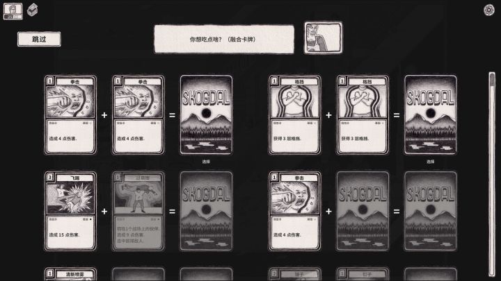 第二个特殊事件为融合卡牌,进入后系统会列出可以融合的组合,玩家可以在满足条件的组合中选择一个,比如两张1费4伤的卡会融合为一张1费2*2伤的卡,乍看之下没有变化,但是配合各类增益效果,能打出比原卡更好的效果。