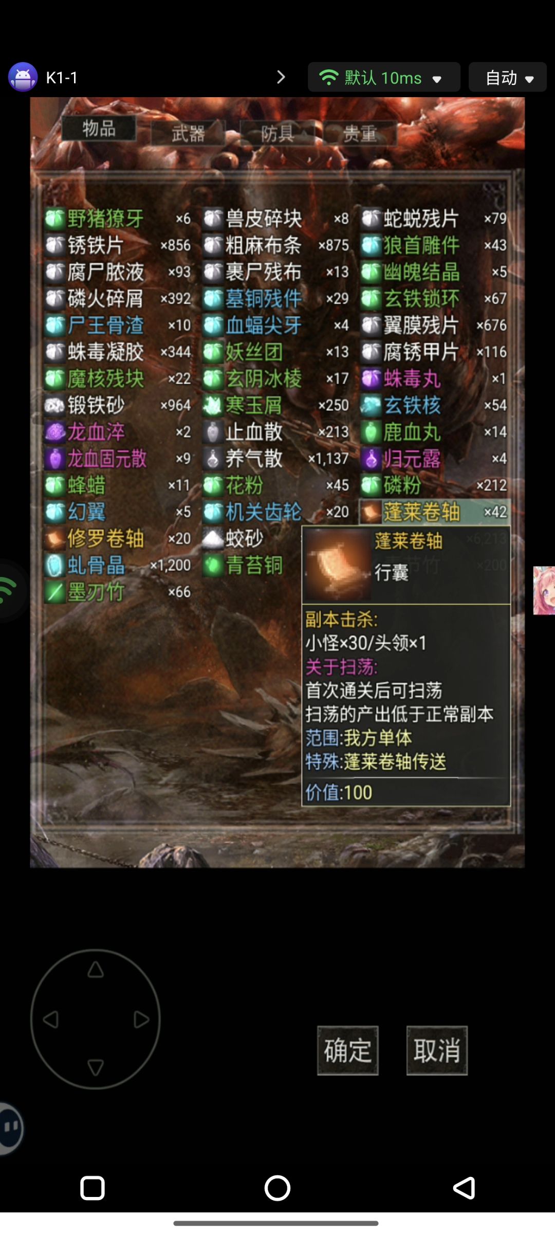 -----武器资料------- 青钢剑lv.1[伤害+3] 粗铁刀lv.3[伤害+6] 青霜棍lv.5[伤害+5] 防御+5 铜纹扇lv.5[伤害+5] 轻功+3 裂石弓lv.5[伤害+10] 硬木弓lv.6[伤害+10] 铁头棍lv.9[伤害+14] 短匕首lv.12[伤害+18] 麻绳鞭lv.15[伤害+22] 皮拳套lv.20[伤害+30] 钢刃剑lv.25[伤害+40] 黑铁锤lv.30