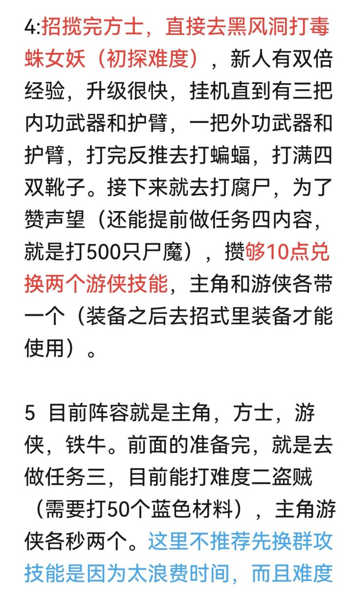 二图快速逃课攻略 1.首先阵容建议搭配,主角、术士、游侠、剑客。主角走内功,这样搭配是为了保证有双群攻和双追星爆发,方便后续的快速升级,多余的外功装备丢给剑客。 2.到二图后,主角走内功,搭配游侠,带上双追星技能,作为主c和副c,两回合秒怪轻轻松松。 3.然后逃课的主要思路是把主c和副c的内功和轻功堆高,方便秒怪,快速升级的同时只穿白绿装,因此后续打怪都是只要内功的装备。 4.先去刷蜂使,