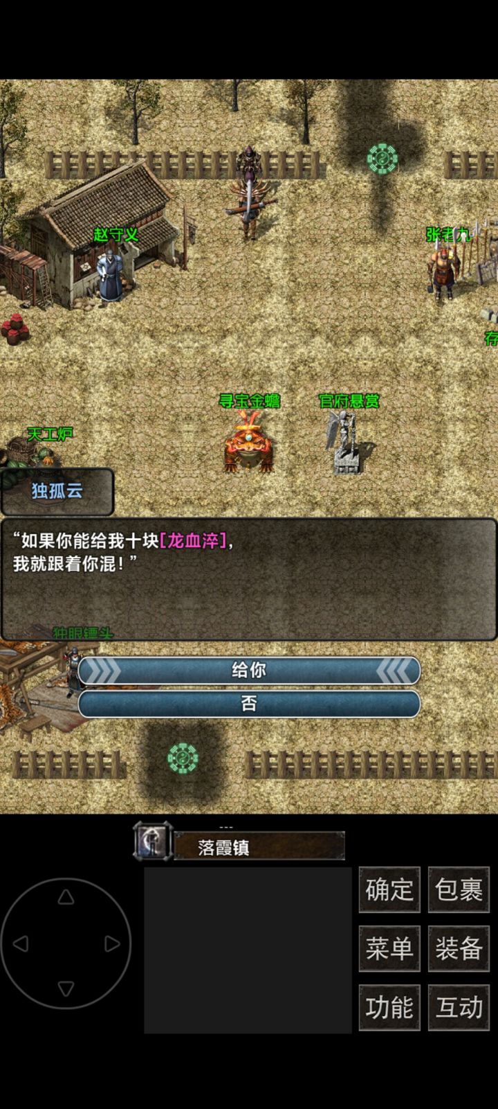 开局- 选项选择:开局全选第一个选项主攻击;全选第二个选项开启阵法主防御吸血;全选第三个主轻功(出手速度)。- 刷龙血:开局刷免费三连抽龙血,没刷到就重开,然后去换独孤云。- 开宝箱:把左上角两个宝箱开了,再兑换群公告里的兑换码。- 挂树:去青竹林东上面挂三小时树,大概可得6个宝石,一个宝石能增加三点攻击,还能拿称号,也可提前做渡船任务。队友招募- 独孤云:新手村左上角对话,需10块紫