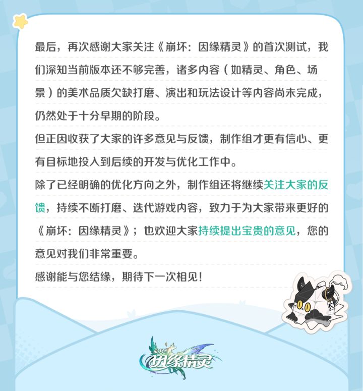 亲爱的玩家,感谢您关注或参与《崩坏:因缘精灵》的首次公开测试。基于测试反馈,制作组明确了一些优化方向,快来看看吧!