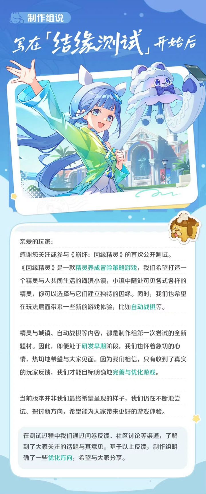 亲爱的玩家,感谢您关注或参与《崩坏:因缘精灵》的首次公开测试。基于测试反馈,制作组明确了一些优化方向,快来看看吧!
