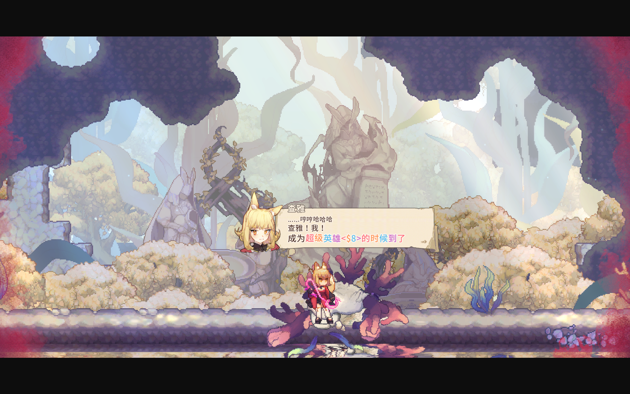 再者,游戏内并不只是在剧情表现方面体现主要角色的可爱之处,游戏的制作组似乎非常懂得如何戳中玩家的萌点,于是在游戏内你可以看到我们的狐狸查雅睡觉前和起床前都会变成四脚着地的狐狸形态睡觉。以及最让我们印象深刻的,游戏开篇教程时看似让玩家选择适合自己的武器,但是当我们选择好武器并确认后,我们的狐狸查雅会折返回来把全部武器都取走,虽然只是简单的过场动画,但却让我对整个游戏的印象留下了浓墨重彩的一笔。可爱,无需多言。