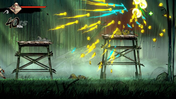 游戏一直鼓励玩家多使用重攻击和手里剑(我更感觉是苦无),快速积攒对手的忍杀条,相比普通的击杀,忍杀既有免伤瞬移功能,还有炫酷的击杀时停特效,更有高额金币奖励。如果搭配上回血符文,基本靠忍杀多产血包来保证续航。