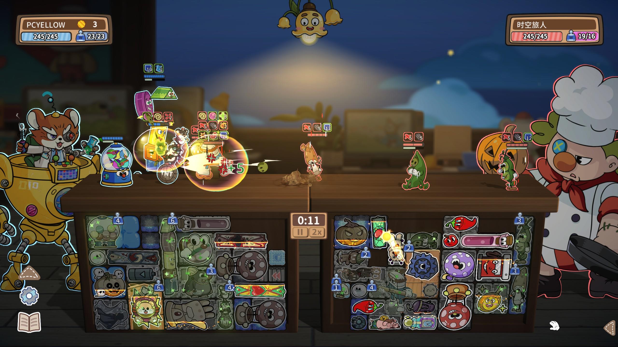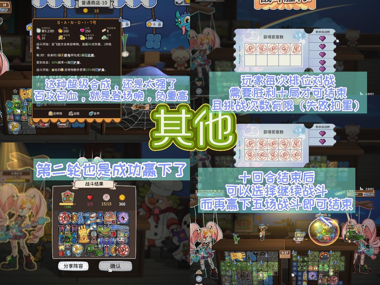 在商店回合,玩家可以自行挑选,在前期一般压力比较小,玩家可以自行组合多多尝试不同类型的玩具召唤物,比如音符、植物、机器等等,装备拥有合成和稀有度机制,初始的大部分玩具都稀有度比较低,需要通过和其他玩具合成更高等级的玩具,有少部分玩具还能继续合成金色传说。除了召唤物玩具外,还有一些提供增益buff的玩具,这些玩具不会上场,只会在背包内持续生效,且大部分需要摆放在正确的星号位置才能生效。
