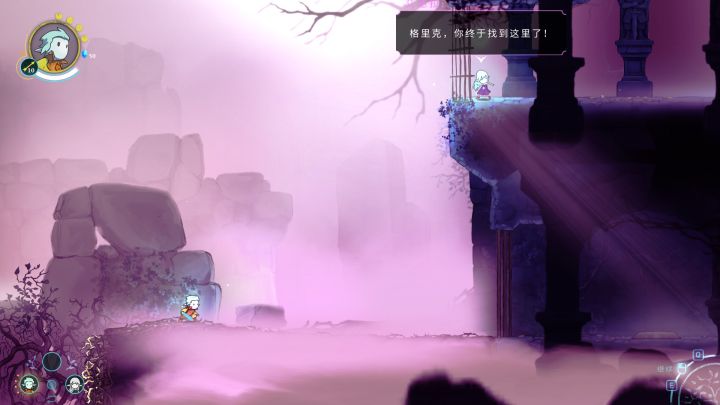 本作玩法上的一大特色是不同主角之间的切换和配合,这就有点类似于“三位一体”系列的感觉,尤其是第二个出场的艾达拉,拥有短时间滞空+自带远程攻击的能力,可以配合近战的主角格雷克做很多事情。