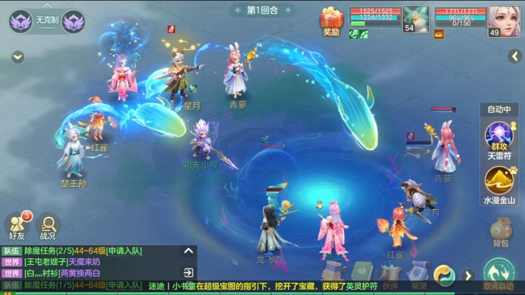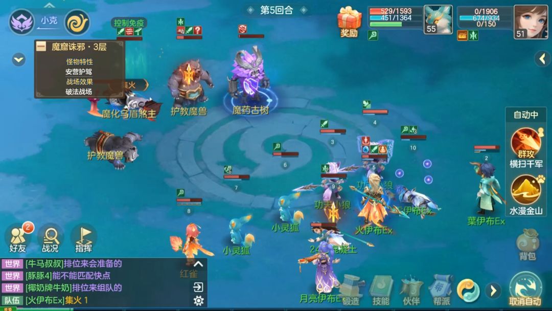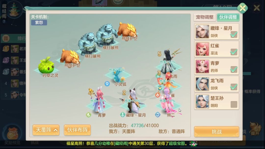 #梦想世界:长风问剑录 藏经阁遇到横扫暴熊,哈哈,这个熊有点憨憨的。技能选的【制雷符】,属于单攻技能,但伙伴技能都挺帅的