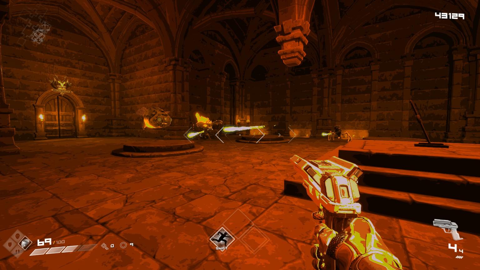 在《BPM: 枪林弹雨》中,玩家扮演的主角需要依靠手中的枪来对付地牢迷宫中各个房间里的怪物。初始只有一个角色可以选择,经过游戏后可以解锁后续的角色。游戏的核心玩法看似与传统的第一人称射击游戏区别只在于加入了“节奏”这一元素,但实际上的游戏体验却大不相同。玩家必须时刻注意HUD上面的节奏提示,只有在节拍的点子上才能进行射击,甚至连换子弹和跳跃、闪避等战术动作也需要踩着节拍才可以实现。