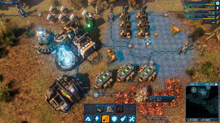 首先是游戏的玩法,基本框架是类似于星际的战略模式,玩家需要采集资源、建造设施、外出打怪等。不同之处在于本作融入了一些塔防要素,对防御设施的摆放有一定要求,根据敌人的进攻方向灵活调整炮台摆放才能事半功倍。此外玩家自己可以操作一台机器人四处探索,遇敌后的战斗方式类似于孤胆枪手,只要你的走位够风骚甚至能玩成无双游戏233