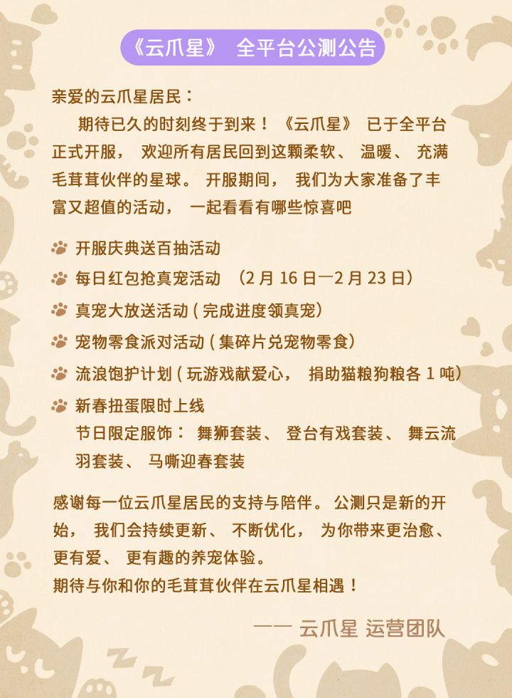 填写问卷即可获得二测资格哦,本次测试将给予大家道具以及实物周边奖励哦!问卷地址:https://v.wjx.cn/vm/h96RkxL.aspx# 也可以从公众号《云爪星》或者Q群:521816572 了解更多资讯