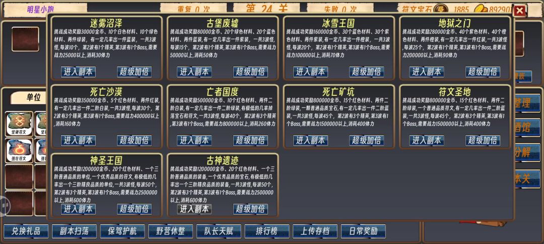 48关了,懒得磨了,基本确定可以通关了把通关攻略写一下。首先不知道是不是作者故意留下的BUG,开战后直接点投降结算,然后等后台把怪打完一样可以拿到全部的钱,所以第一关开始就要把11次重复和11次战败打满。然后是升级顺序,第五关前,8个出战人物买满不要升级,把剩余的钱买装备。10关之前把白色装备买满,不升级旅馆和商店。难点是15关和31关,15关之前不升级旅馆的情况下把人物全部合成到3级。然