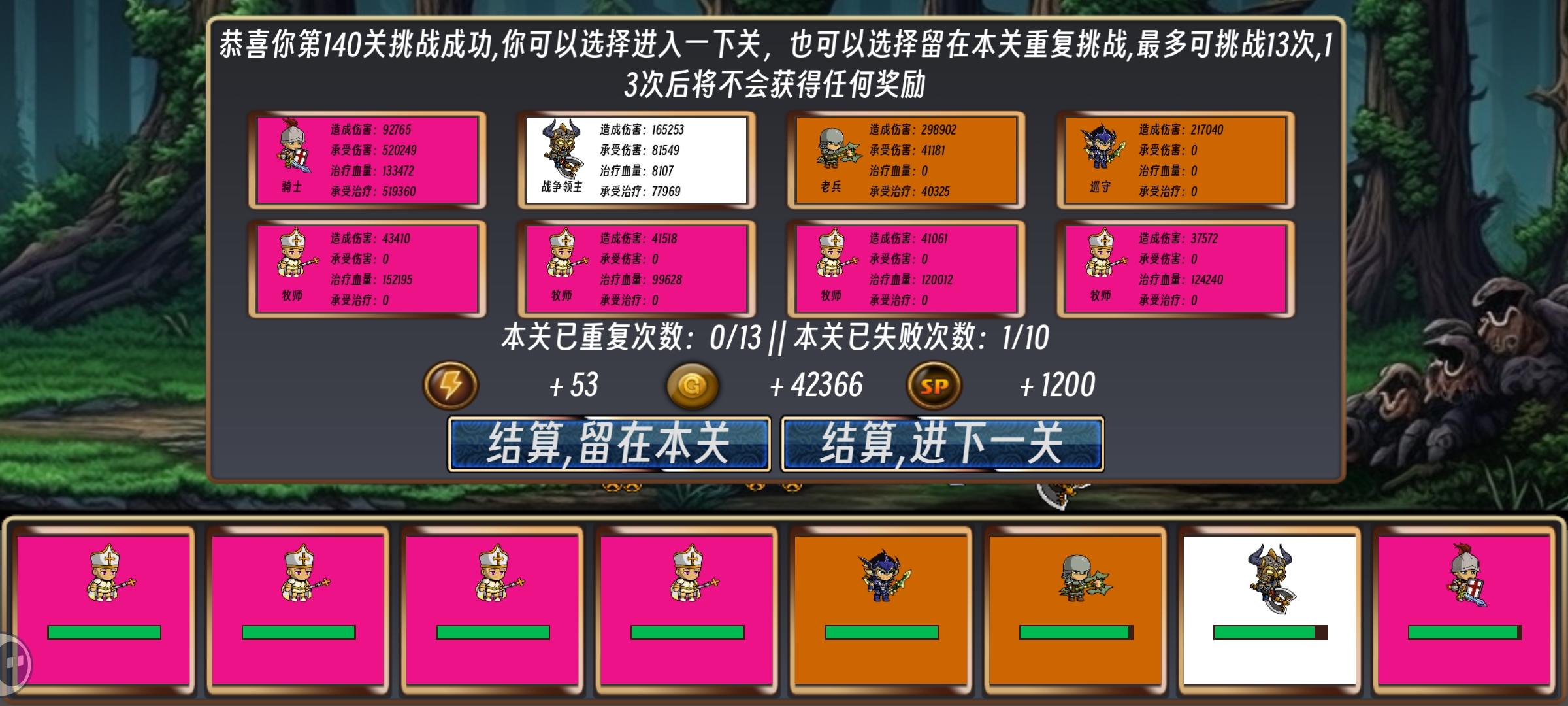 48关了,懒得磨了,基本确定可以通关了把通关攻略写一下。首先不知道是不是作者故意留下的BUG,开战后直接点投降结算,然后等后台把怪打完一样可以拿到全部的钱,所以第一关开始就要把11次重复和11次战败打满。然后是升级顺序,第五关前,8个出战人物买满不要升级,把剩余的钱买装备。10关之前把白色装备买满,不升级旅馆和商店。难点是15关和31关,15关之前不升级旅馆的情况下把人物全部合成到3级。然