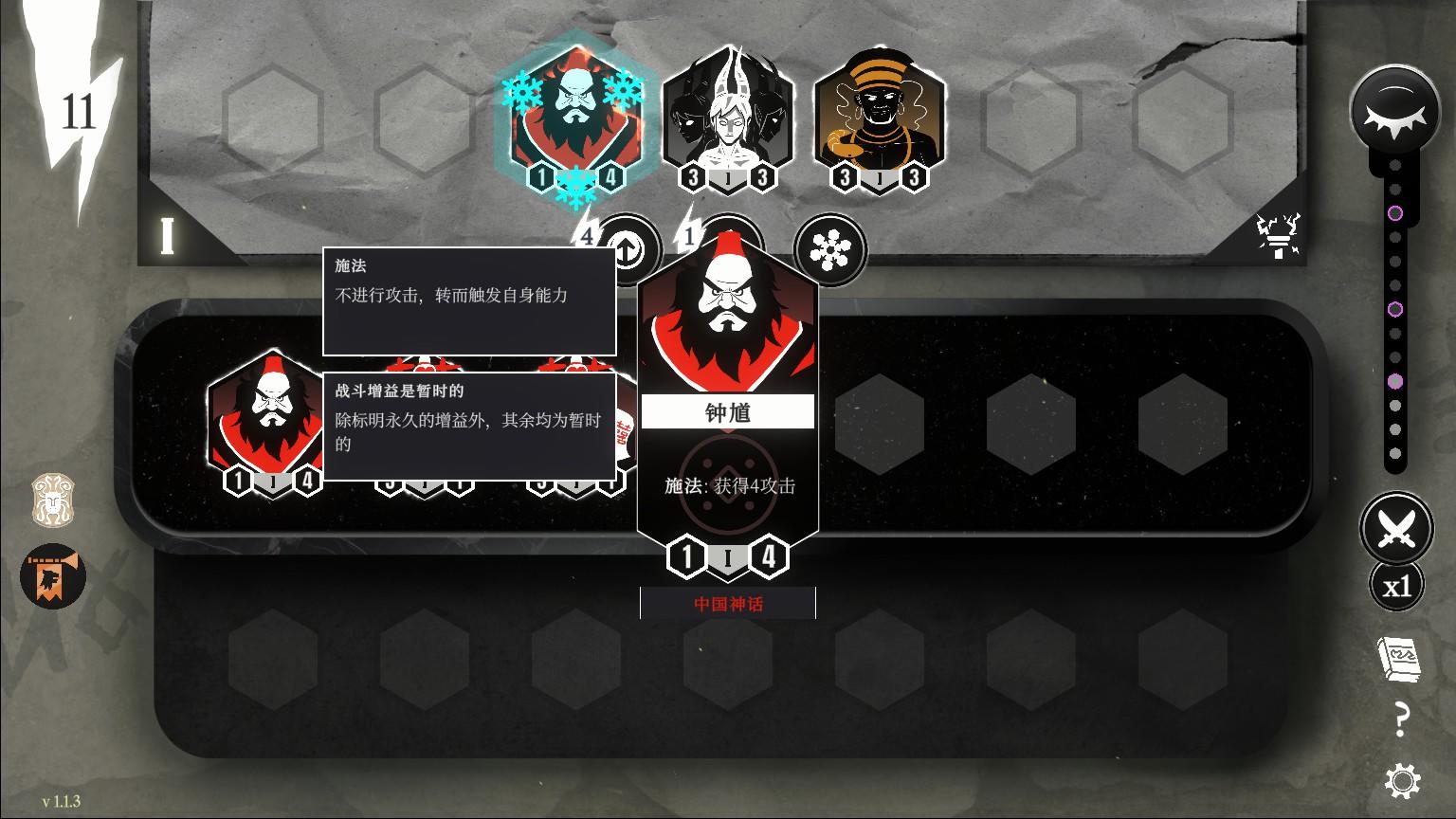 构筑的过程就是尽量选择中国神,因为一开始只有10个精华,选一次神要3个精华,第一轮至少要拿到两个神,如果不够可以随便先选别个别的体系的神先顶一下。如果精华没用完,会被清掉。所以最后几个精华继续刷新,发现要选的神可以先冻结等下一轮在选,至少不能浪费了精华。