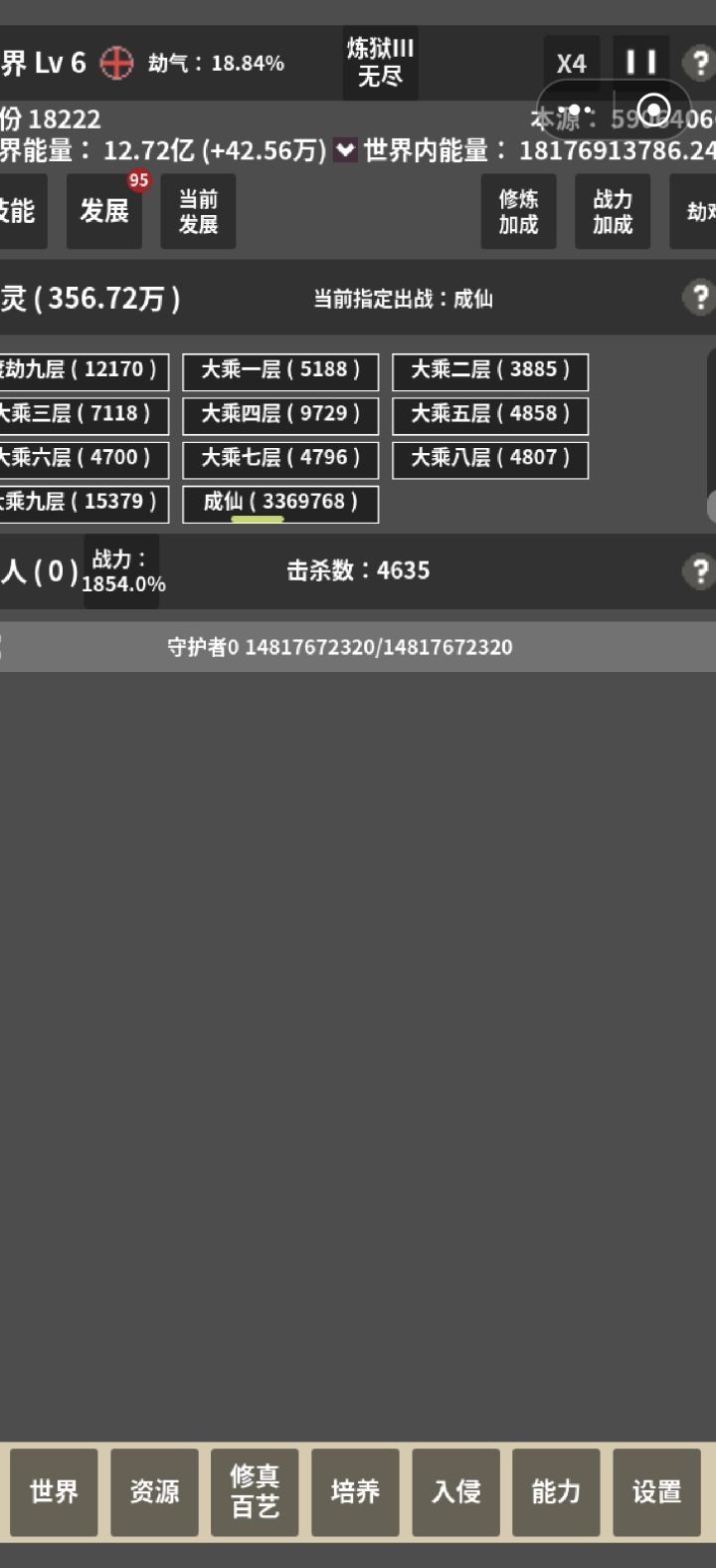 1,炼狱3,11000年达到了18亿本源,58万仙人。